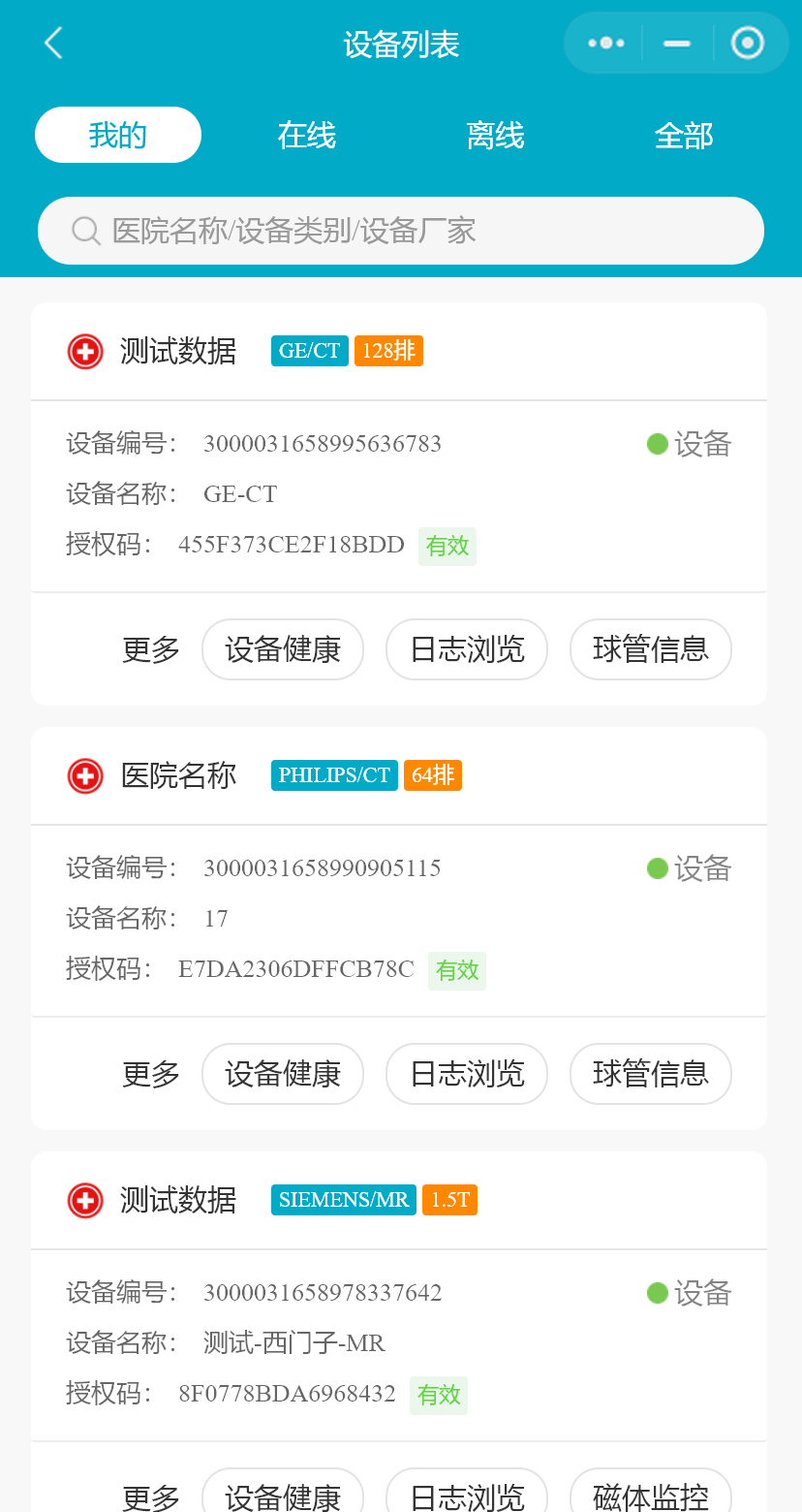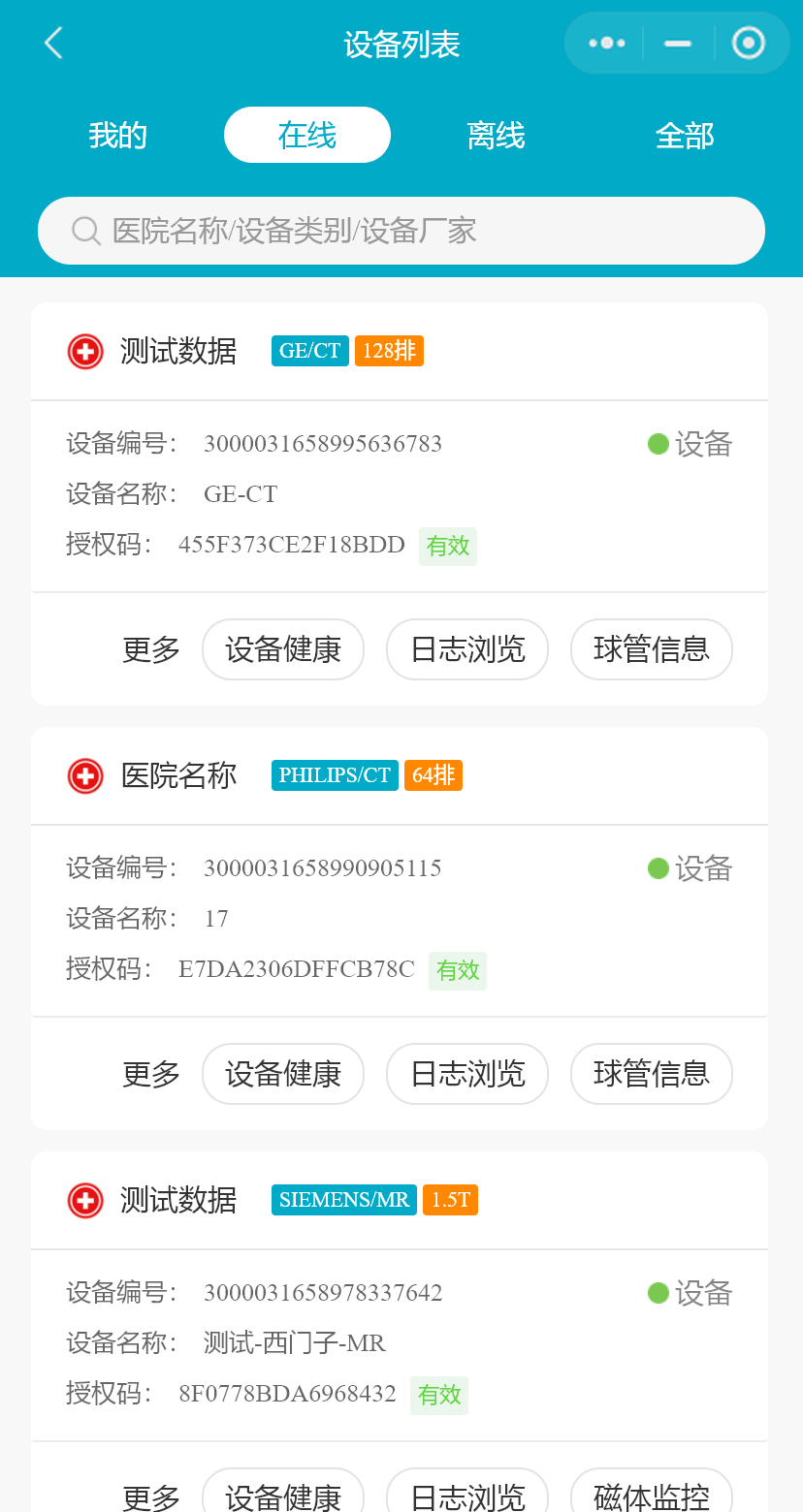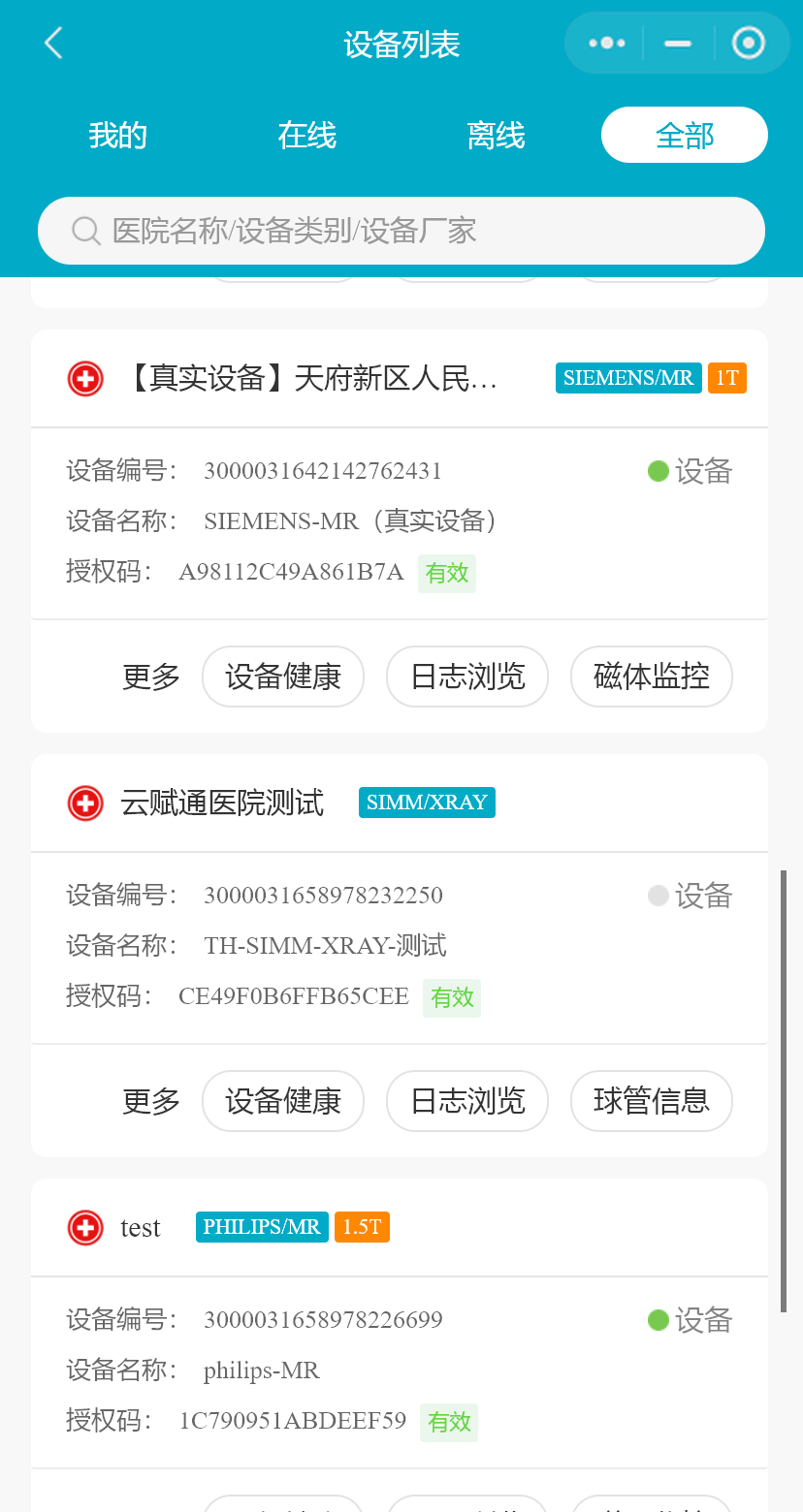 点击设备列表中“全部”按钮,将展示云探医联系统中已注册成功过并且设备状态为“在线”和“离线”的设备。