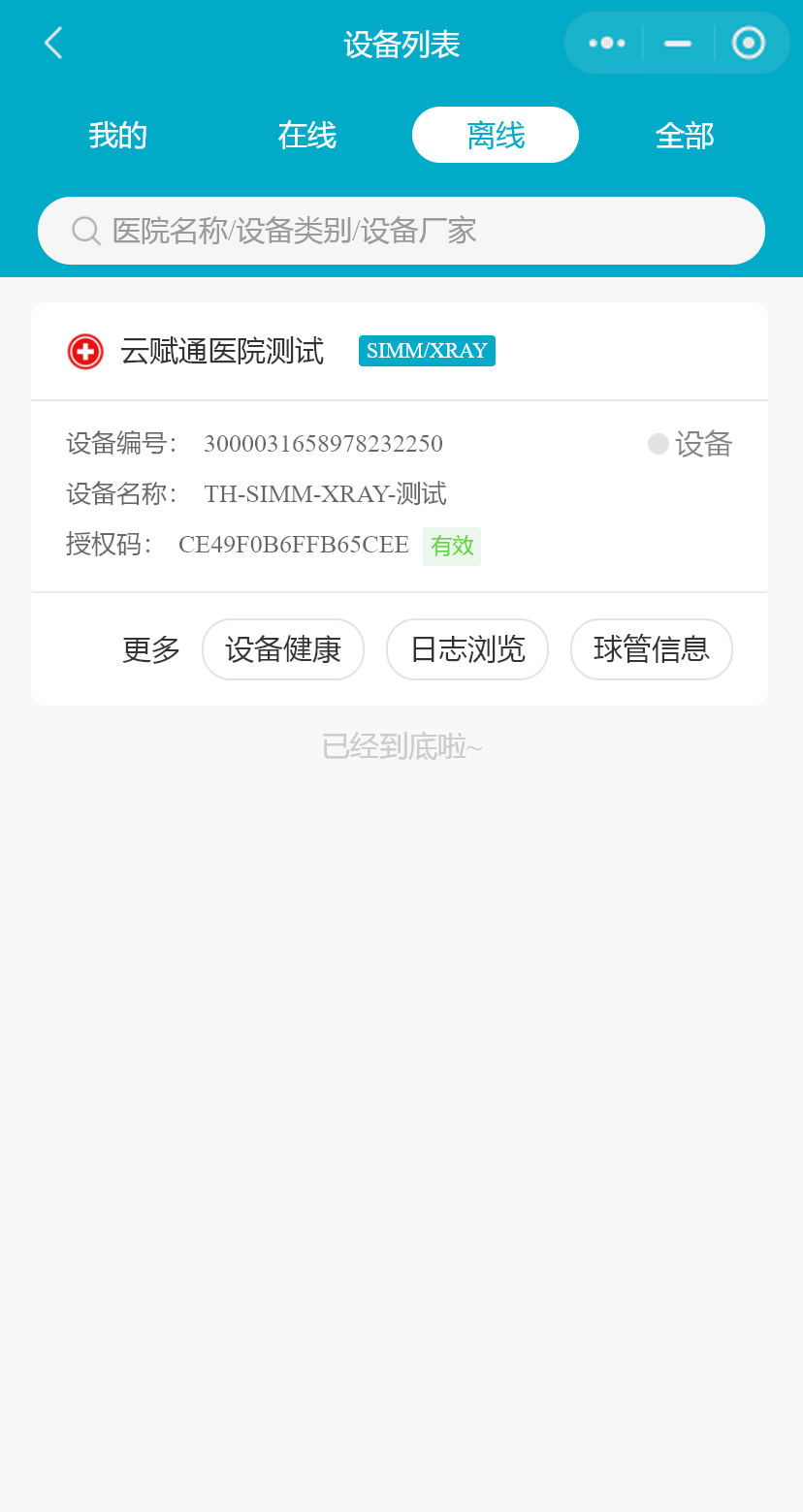 点击设备列表中“离线”按钮,将展示云探医联系统中已注册成功并且设备状态为“离线”的设备。