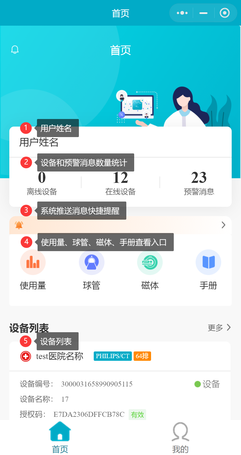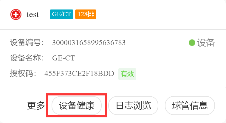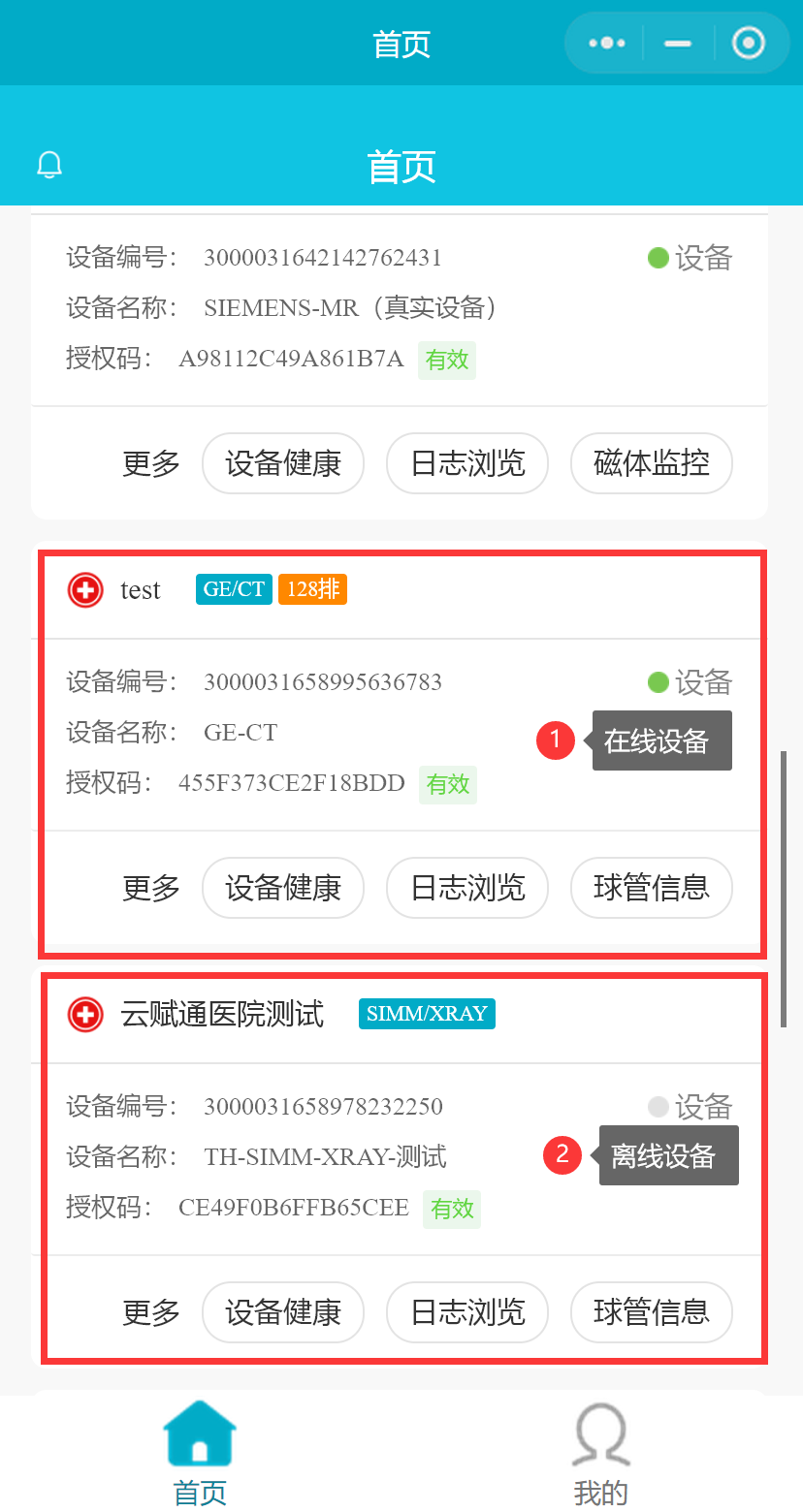 - 设备列表(包含所有在线的设备、离线的设备,并同时展示该设备的状态、设备编号、设备厂家、设备类别、医院名称、设备名称和授权码信息)