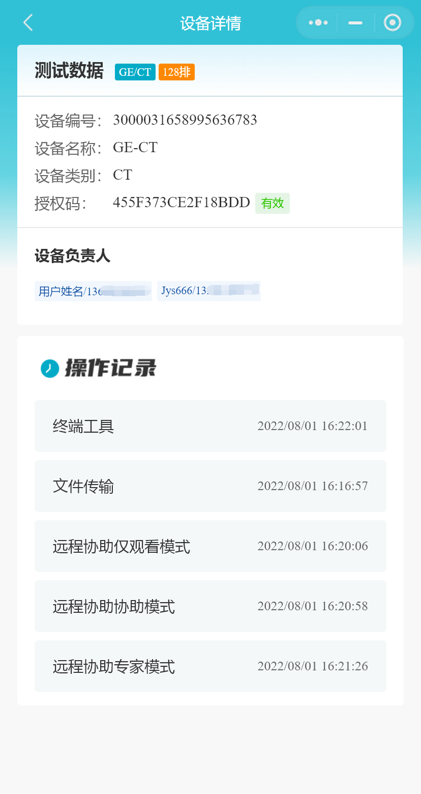 在首页>>设备列表中,点击一台设备,页面将跳转至“设备详情”页,“设备详情”包含了该台设备的设备编号、设备厂家、医院名称、设备名称、设备类别、绑定的授权码、所有设置的设备负责人以及该台设备的最后一次操作记录(终端工具、文件传输、远程协助仅观看模式、远程协助协助模式、远程协助专家模式、高级维修工具协助模式、高级维修工具专家模式)