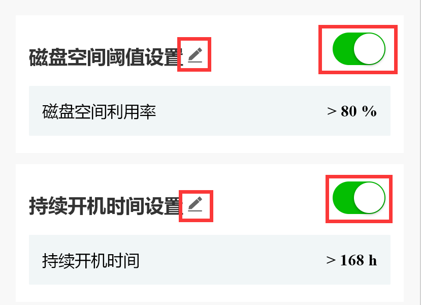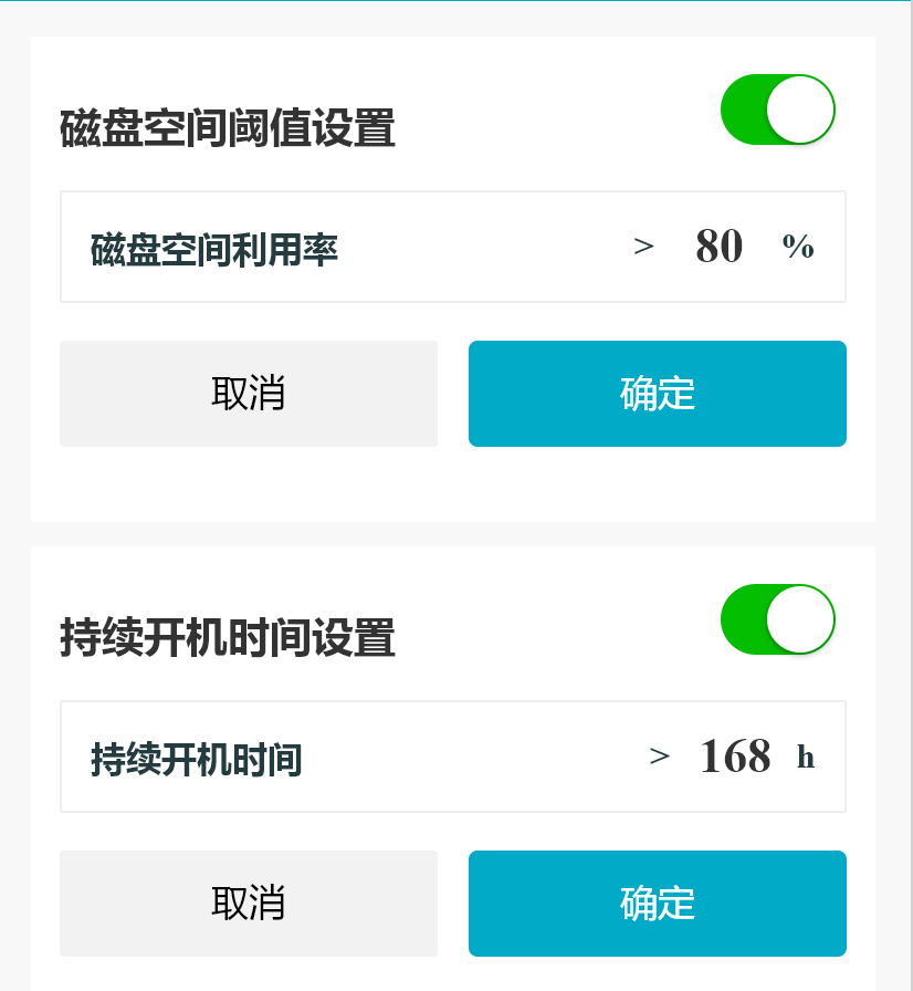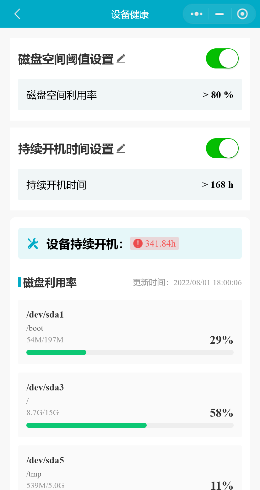小程序支持用户设置设备当前持续开机时间与磁盘空间使用状态的阈值,用户可禁用或启用某一参数预警,被禁用的参数不再产生报警记录。(医院用户不可禁用或启用参数预警)