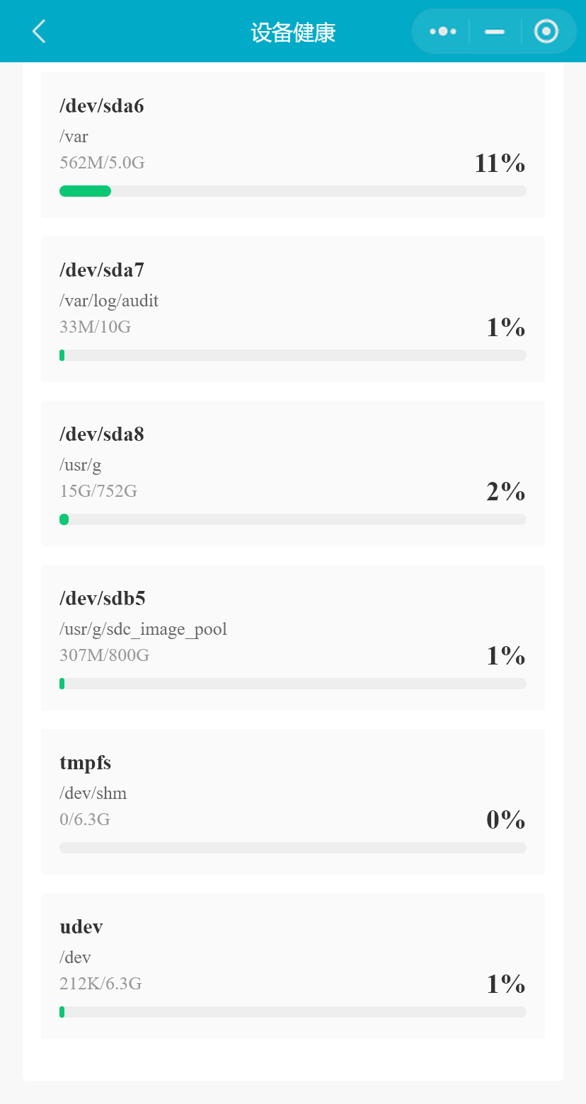 在设备列表中,选择一台设备,点击按钮,进入“设备健康”页面,将展示设备的持续开机时长和磁盘利用率等信息。