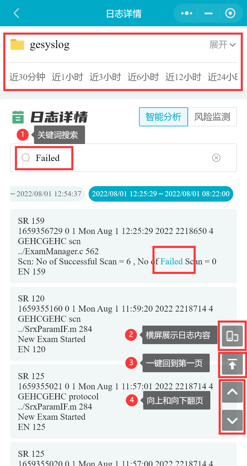 在设备列表中,选择一台设备,点击按钮,进入“日志详情”页面,将展示设备下可以查看的日志文件内容。(“日志浏览”医院用户不可见)