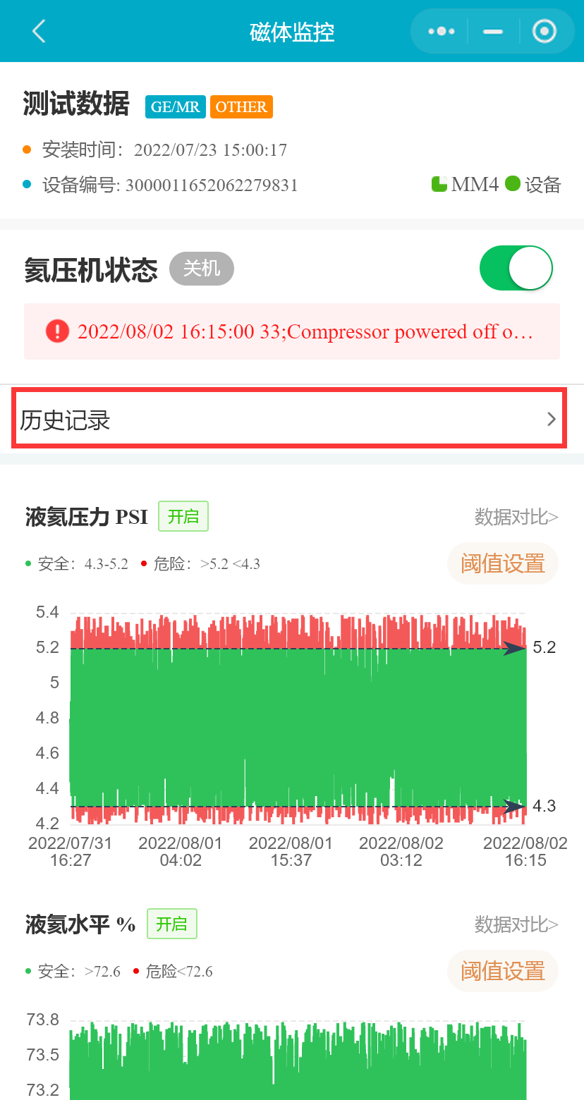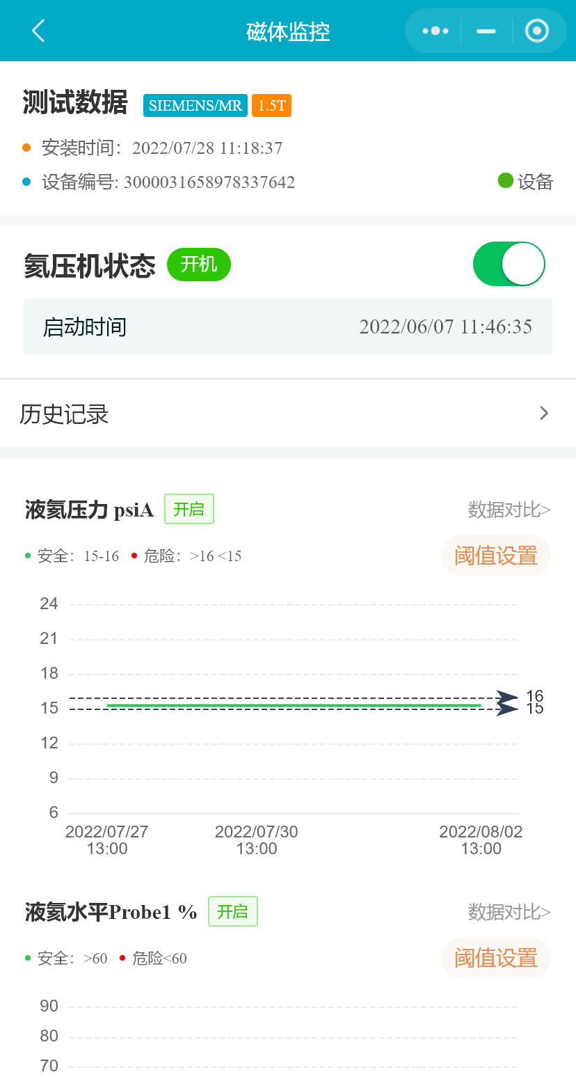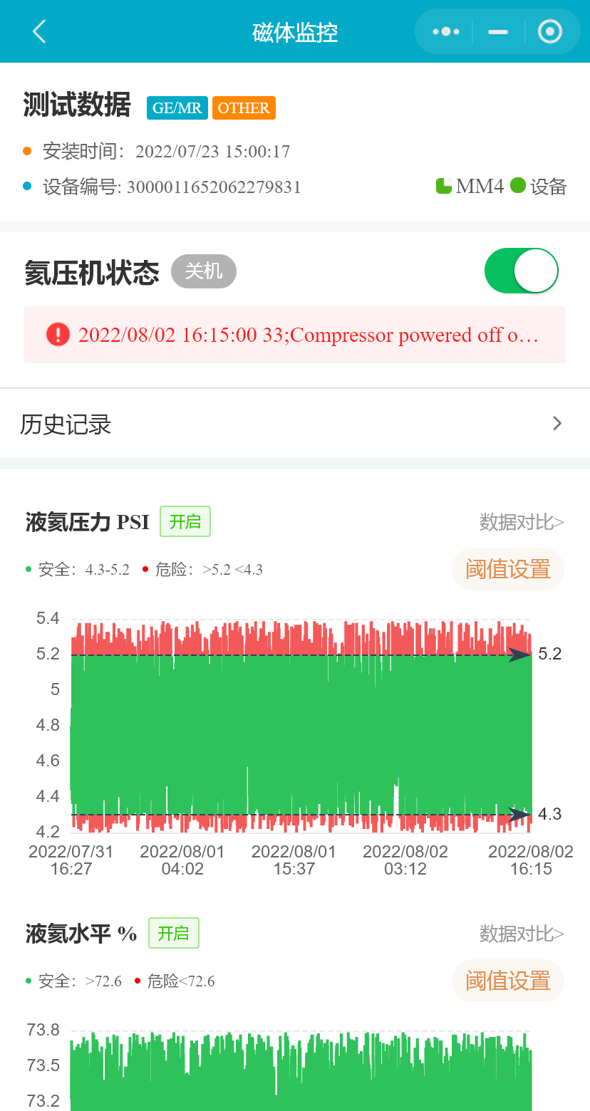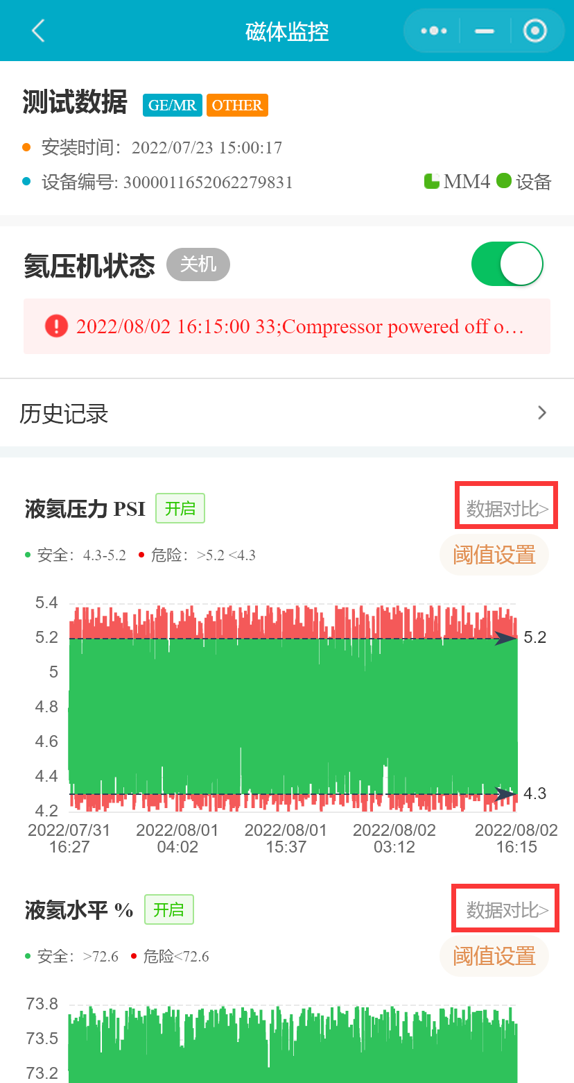 在设备列表中,选择一台MR设备,点击按钮,进入“磁体监控”页面,将展示MR设备磁体监控的数据和设置的阈值,氦压机状态等