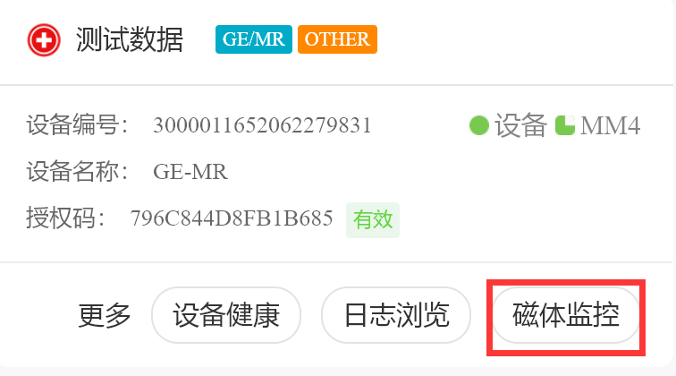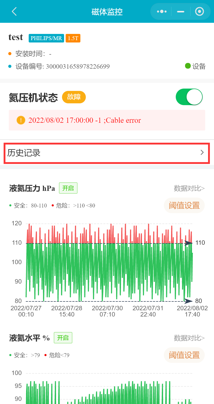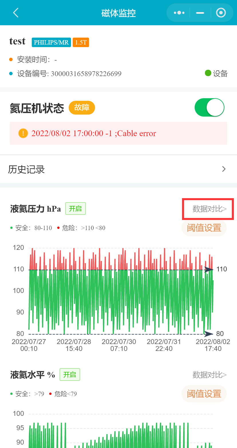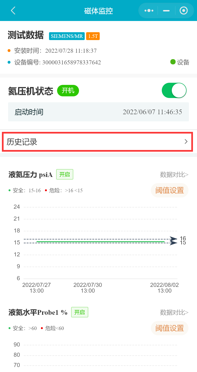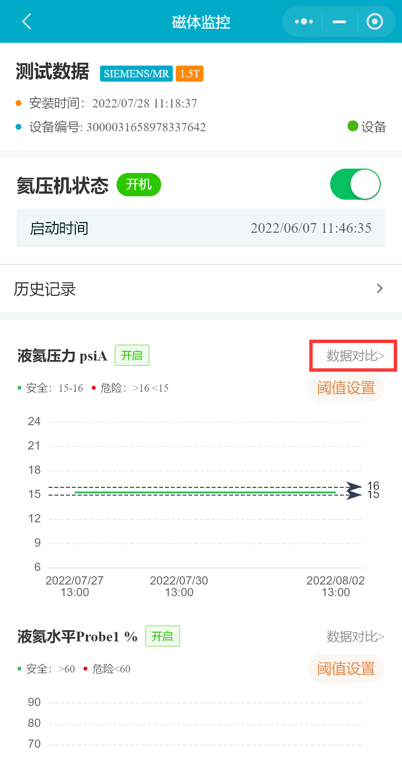 在设备列表中,选择一台MR设备,点击按钮,进入“磁体监控”页面,将展示MR设备磁体监控的数据和设置的阈值,氦压机状态等
