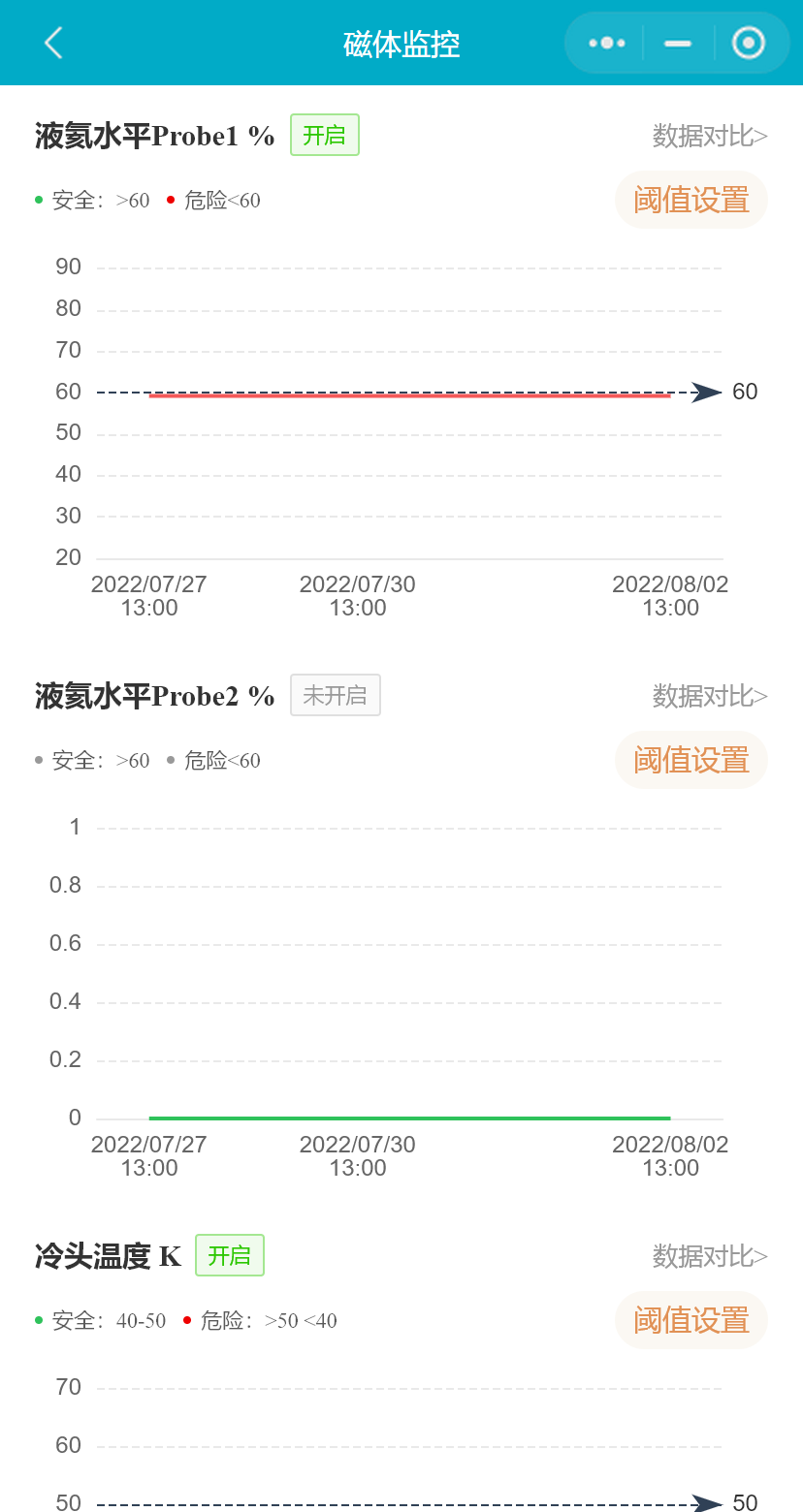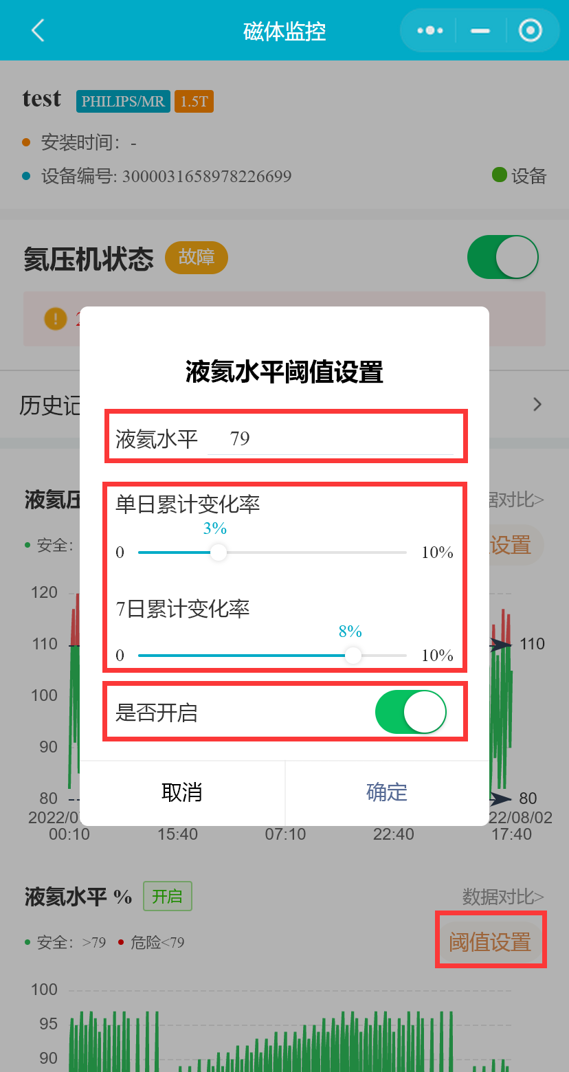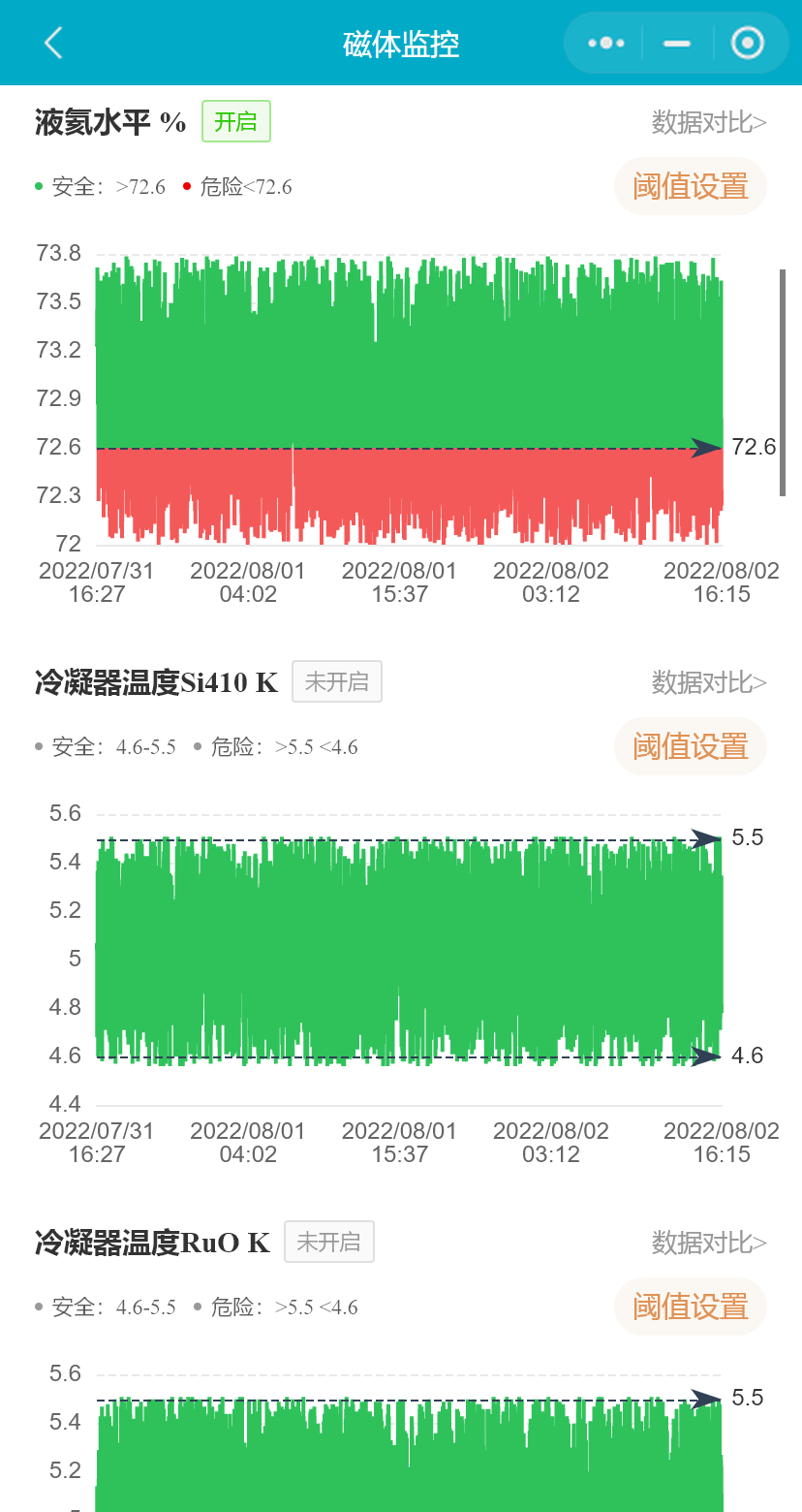 小程序支持用户设置磁体的液氦水平下限、液氦水平每日变化率和7日累计变化率、冷凝器温度(Si410)、屏蔽层温度、冷凝器温度(RuO)、冷头温度(RuO)、液氦压力、水温、水流、设备间温度、设备间湿度、操作间温度、操作间湿度、磁体洞温度阈值范围,并能启用或禁用相关参数预警通知。(医院用户不可禁用或启用参数预警)