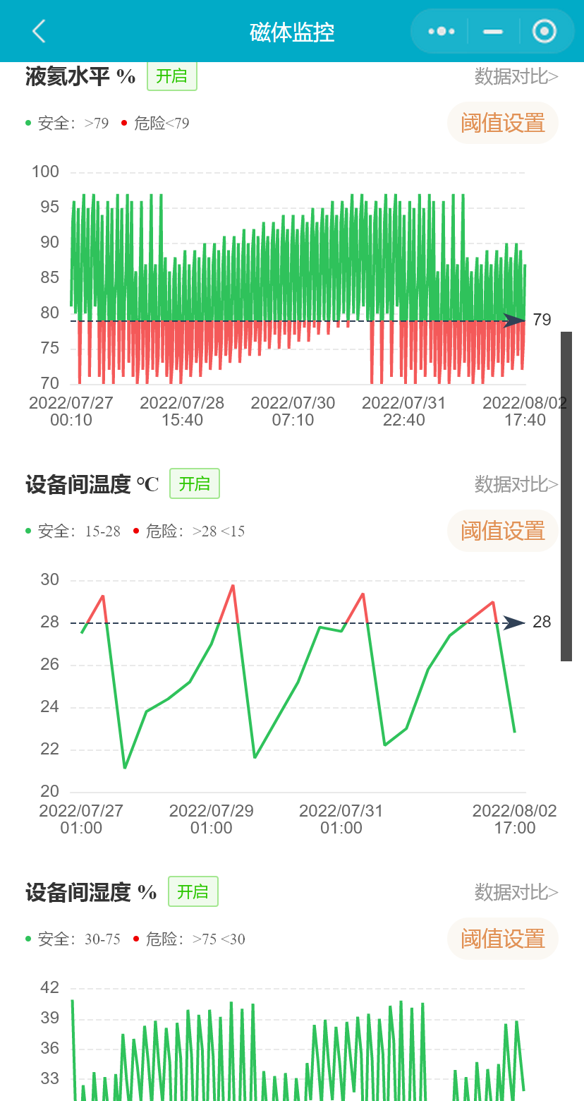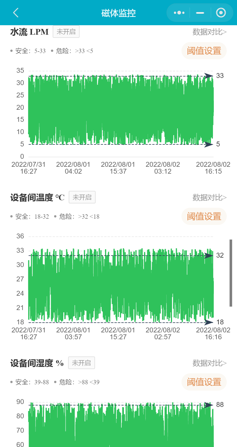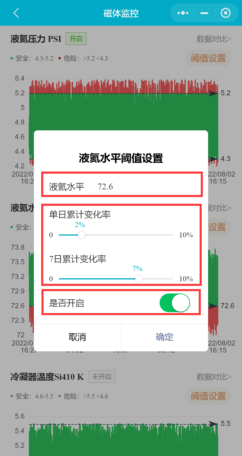 小程序支持用户设置磁体的液氦水平下限、液氦水平每日变化率和7日累计变化率、冷凝器温度(Si410)、屏蔽层温度、冷凝器温度(RuO)、冷头温度(RuO)、液氦压力、水温、水流、设备间温度、设备间湿度、操作间温度、操作间湿度、磁体洞温度阈值范围,并能启用或禁用相关参数预警通知。(医院用户不可禁用或启用参数预警)