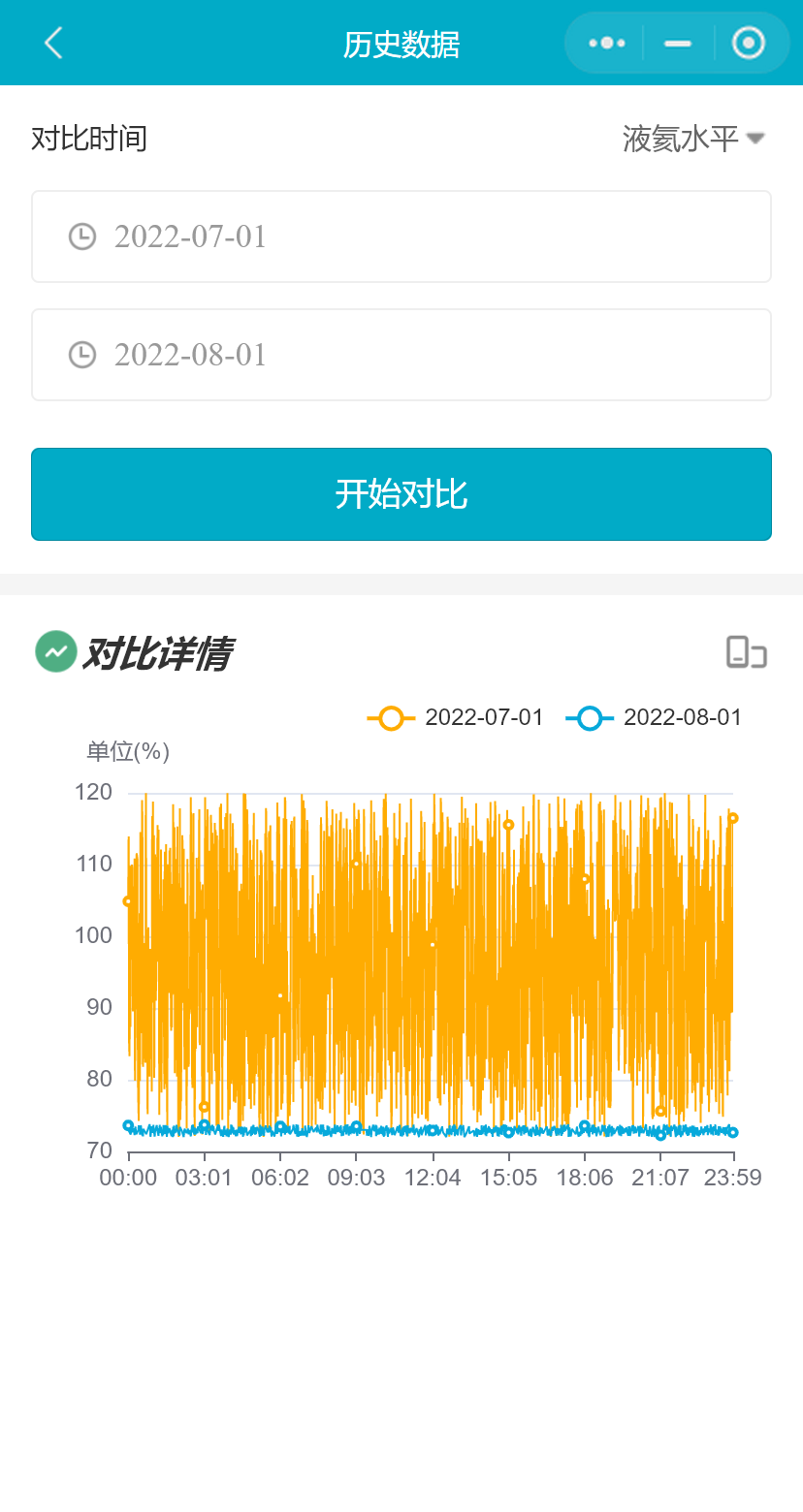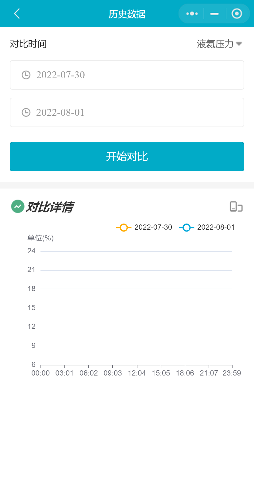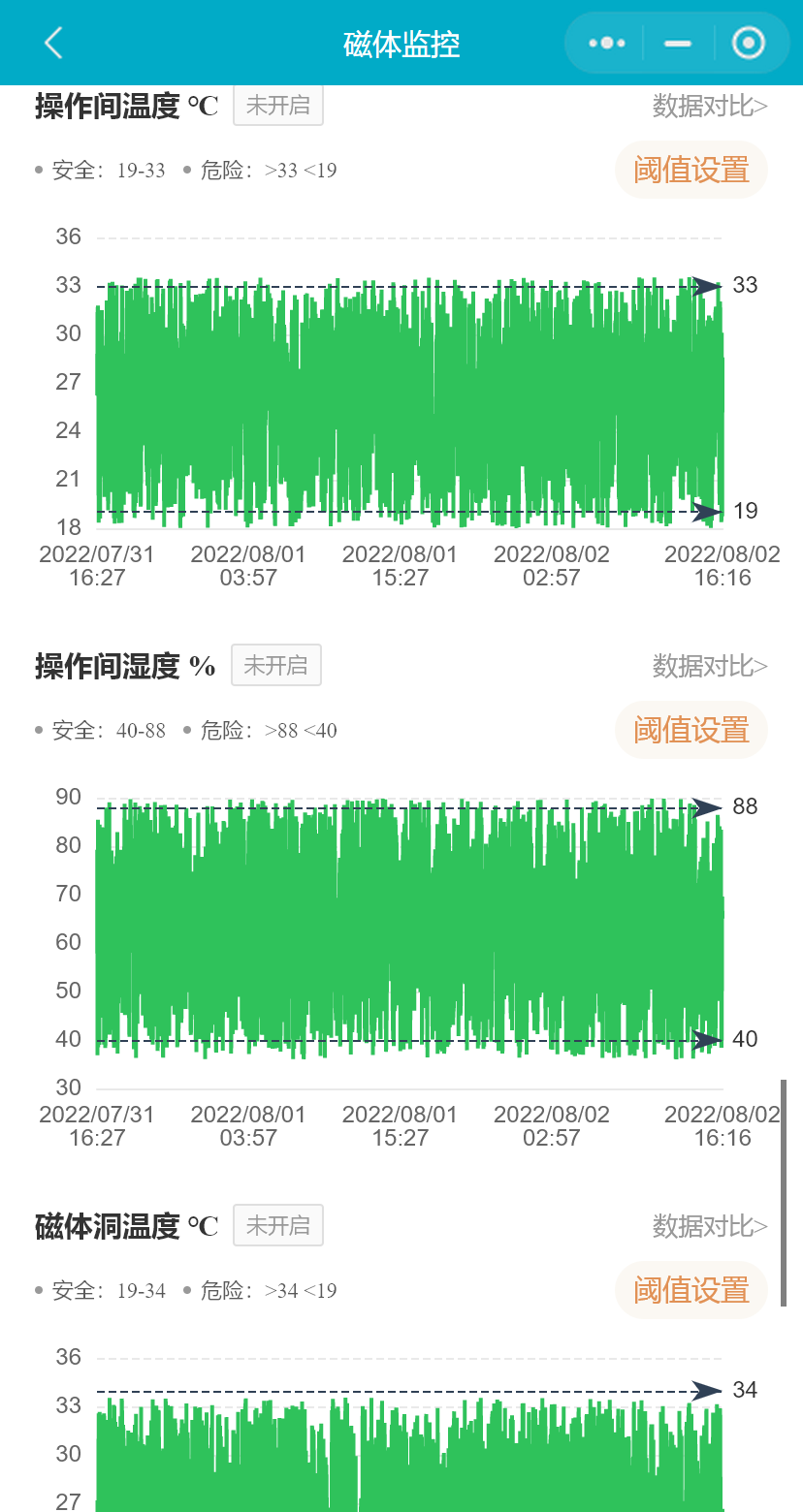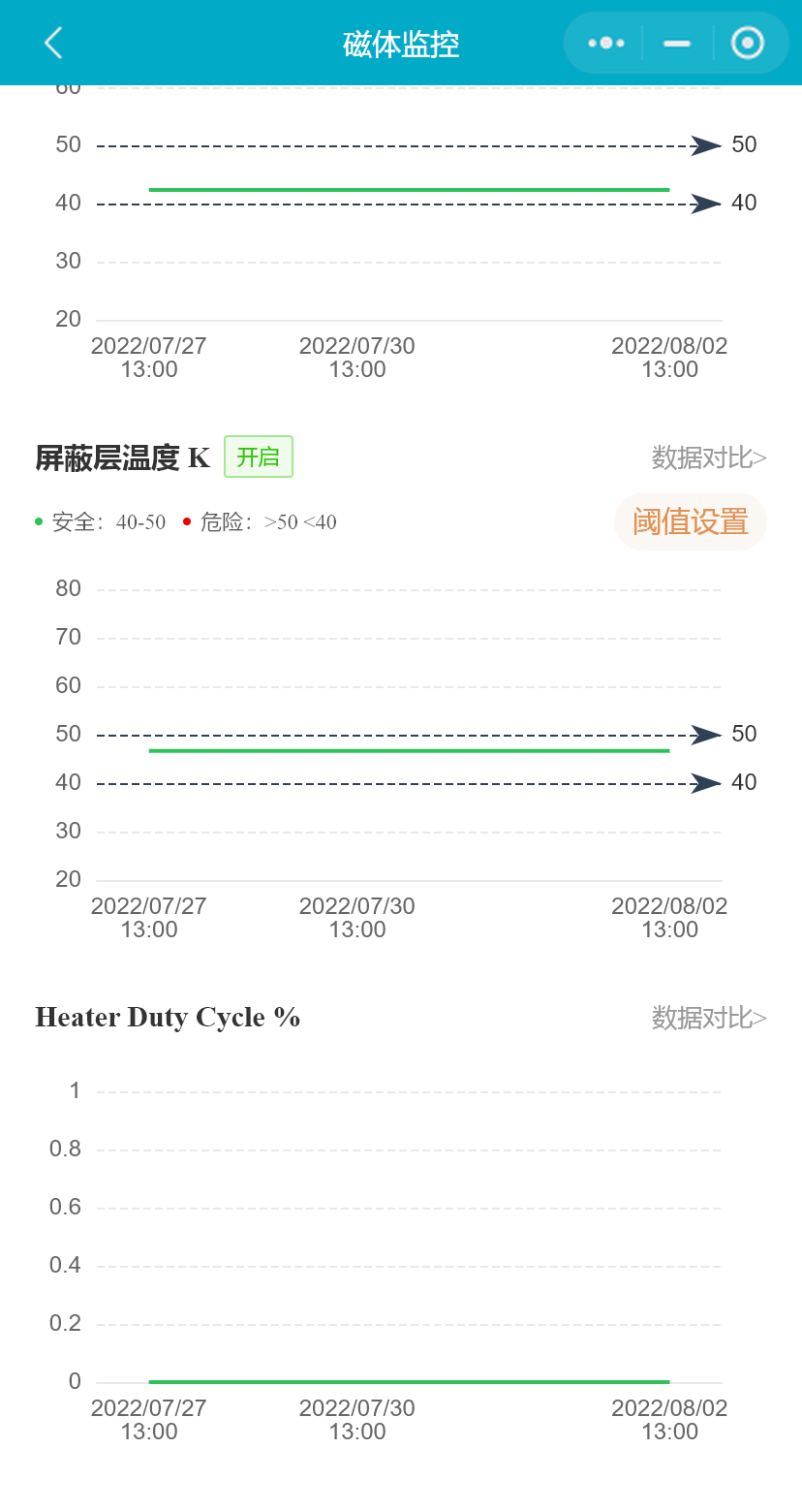 小程序支持用户对比365天内任意两个自然天的磁体监控数据,在2个对比时间处选择不同的日期开始对比,同时用户可以切换要对比数据的磁体监控项;支持用户横屏查看历史对比数据。