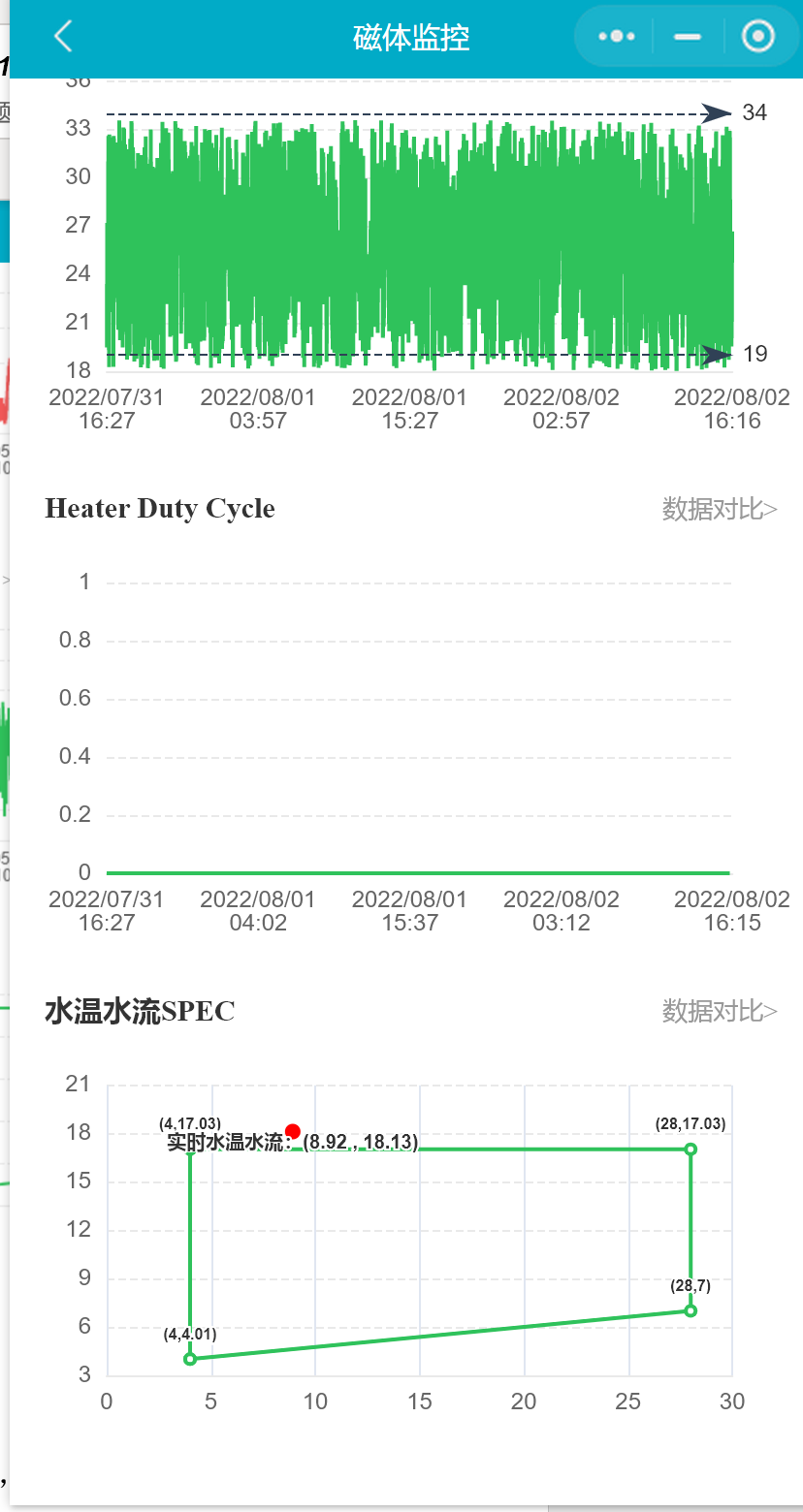 小程序可以展示最近2天磁体的氦压机状态(启停机时间及描述)、液氦水平、冷凝器温度(Si410)、屏蔽层温度、冷凝器温度(RuO)、冷头温度(RuO)、液氦压力、Heater Duty Cycle、水温、水流、水温水流SPEC、设备间温度、设备间湿度、操作间温度、操作间湿度、磁体洞温度等监控数据。