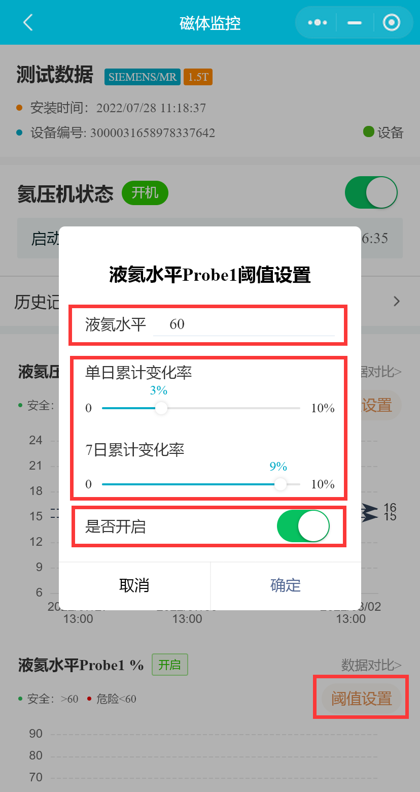 小程序支持用户设置磁体的液氦压力、液氦水平下限(Probe1 Level&Probe2 Level)、液氦水平每日变化率和7日累计变化率、冷头温度、屏蔽层温度阈值范围,并能启用或禁用相关参数预警通知。(医院用户不可禁用或启用参数预警)