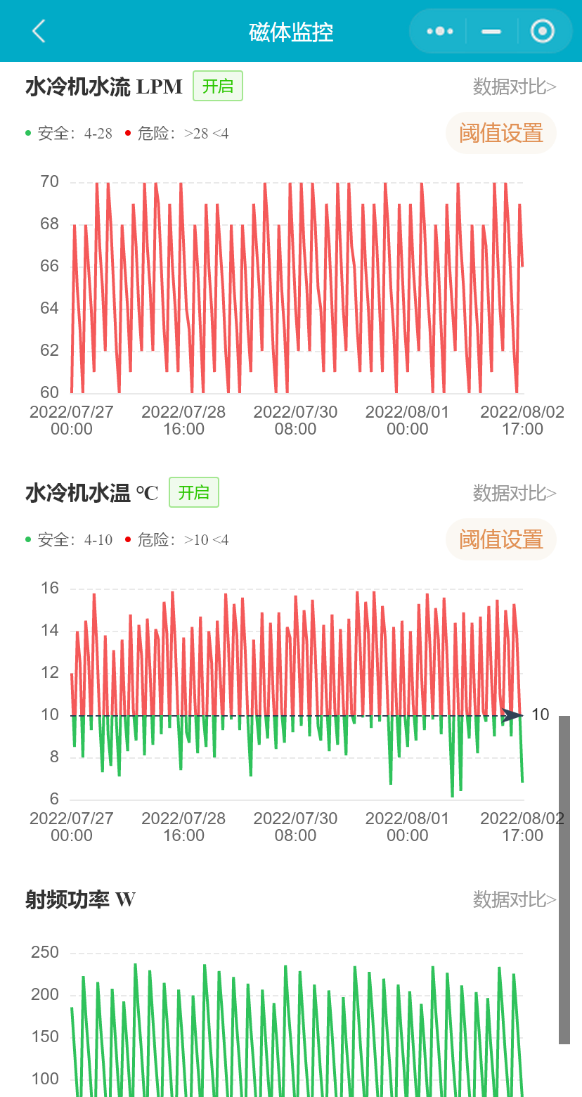 小程序可以展示最近7天磁体的氦压机状态(启停机时间及描述)、液氦压力、液氦水平、设备间温度、设备间湿度、水冷机水流、水冷机水温、射频功率等监控数据