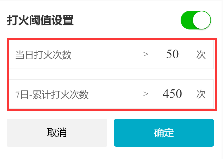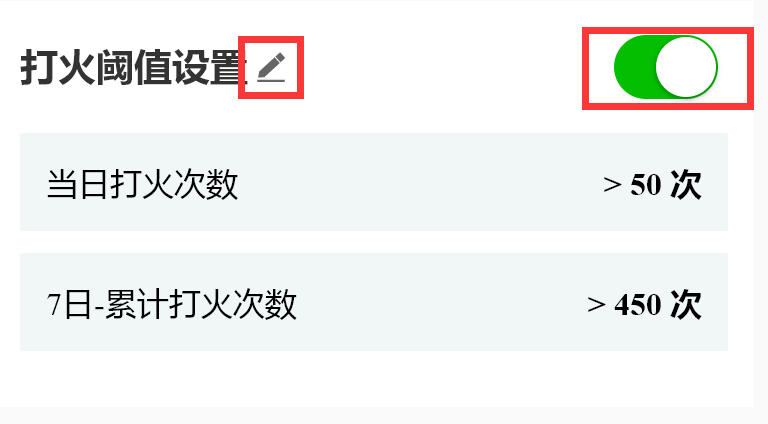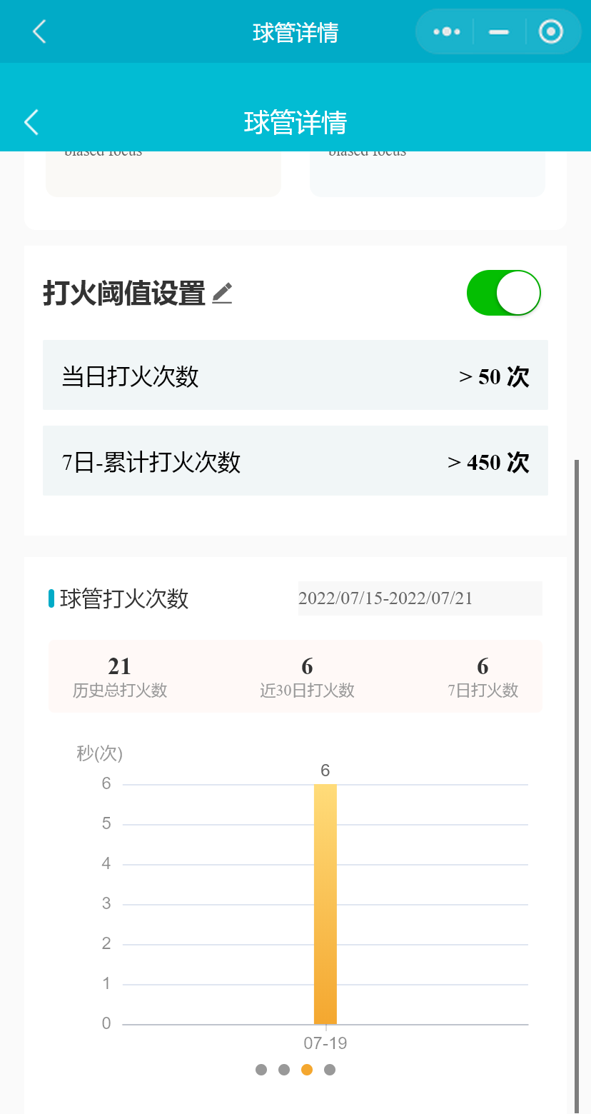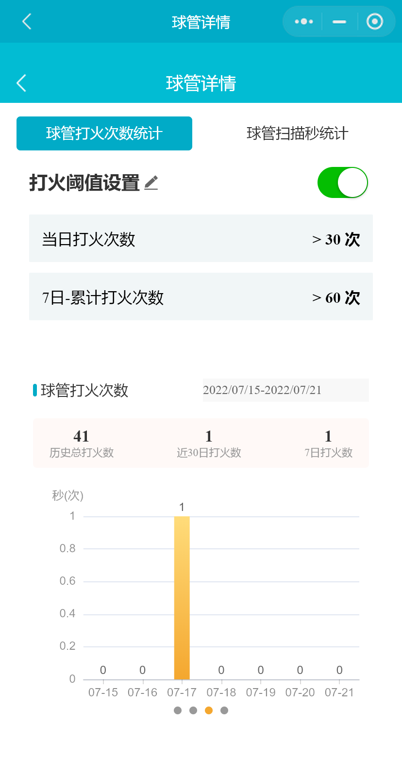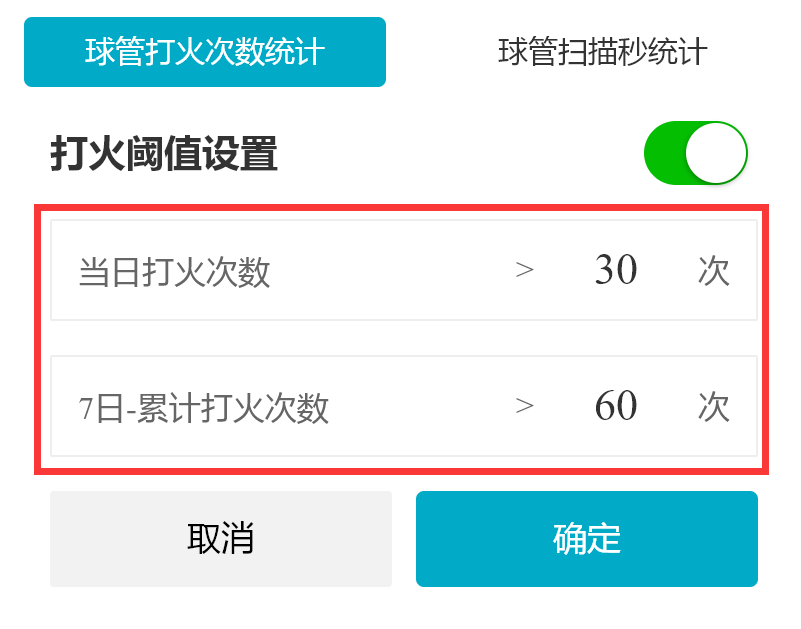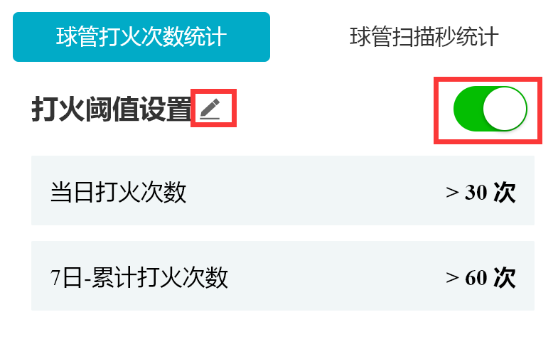 小程序支持用户设置设备每日打火记录与7日打火记录累计值阈值,用户可禁用或启用参数预警,被禁用后不再产生报警记录。(医院用户不可禁用或启用参数预警)
