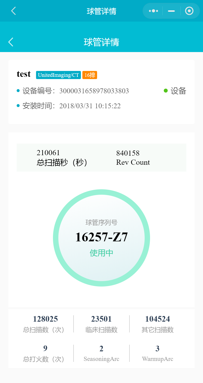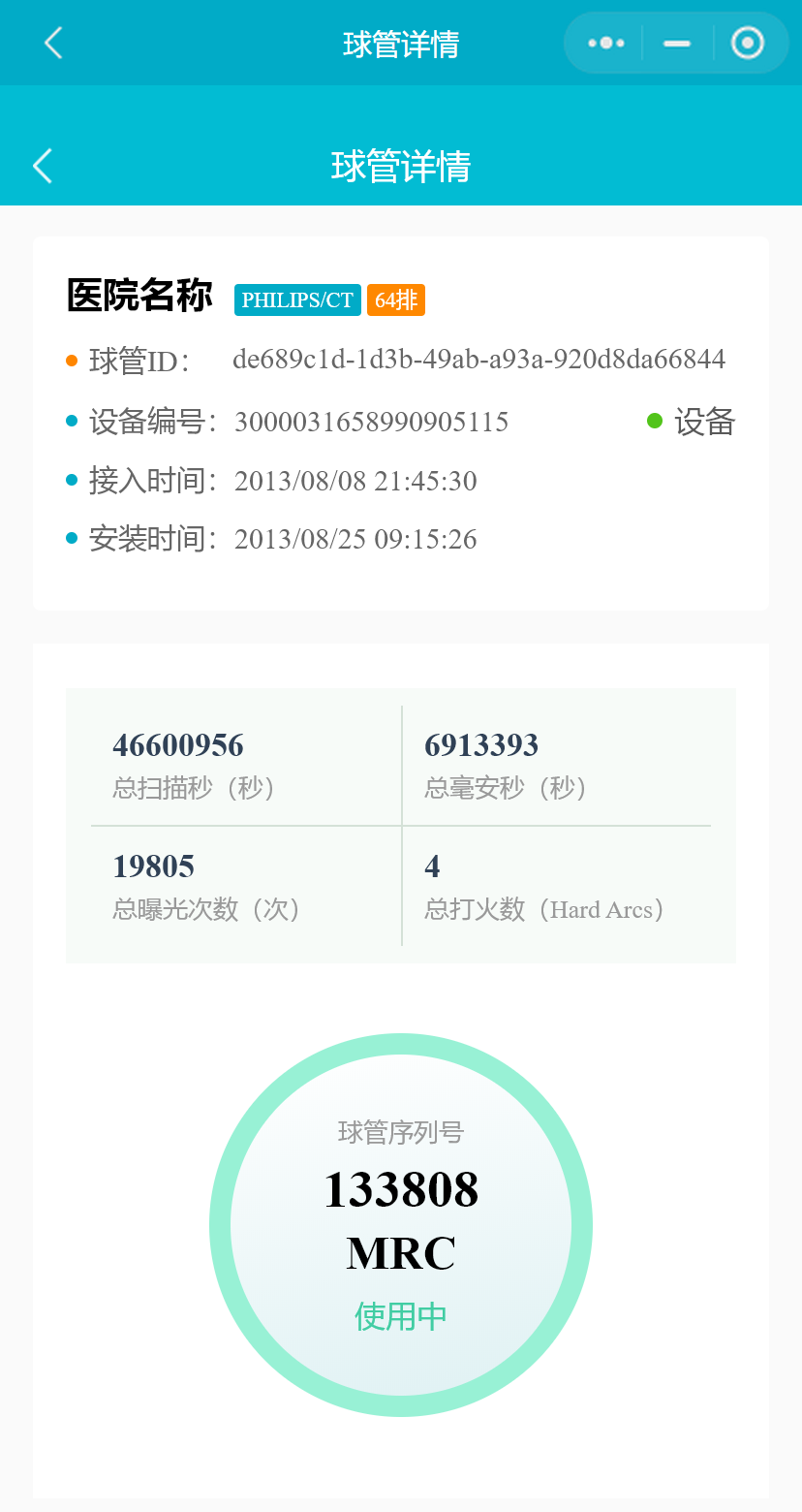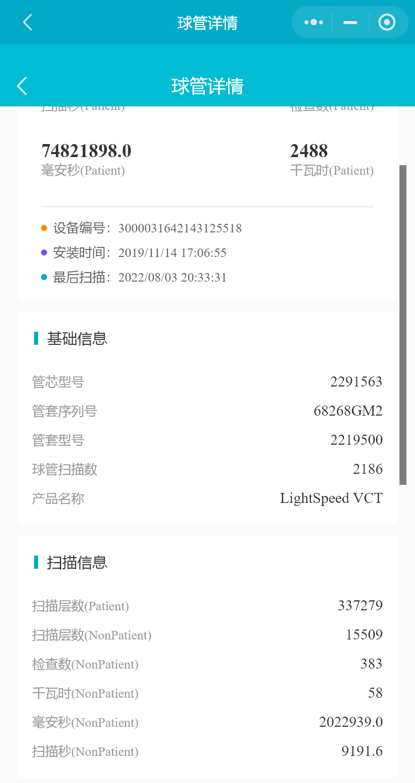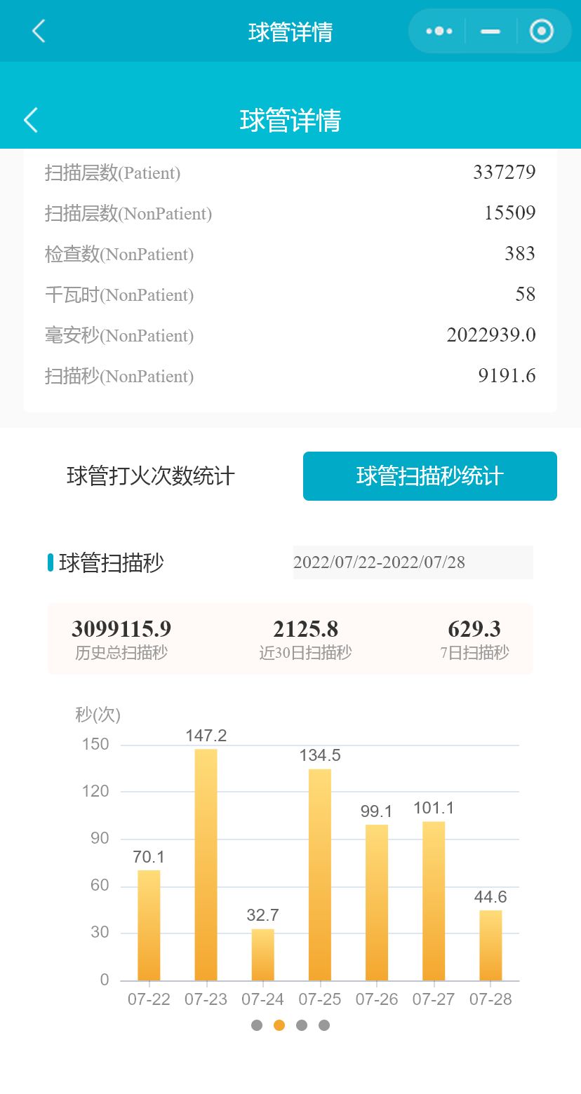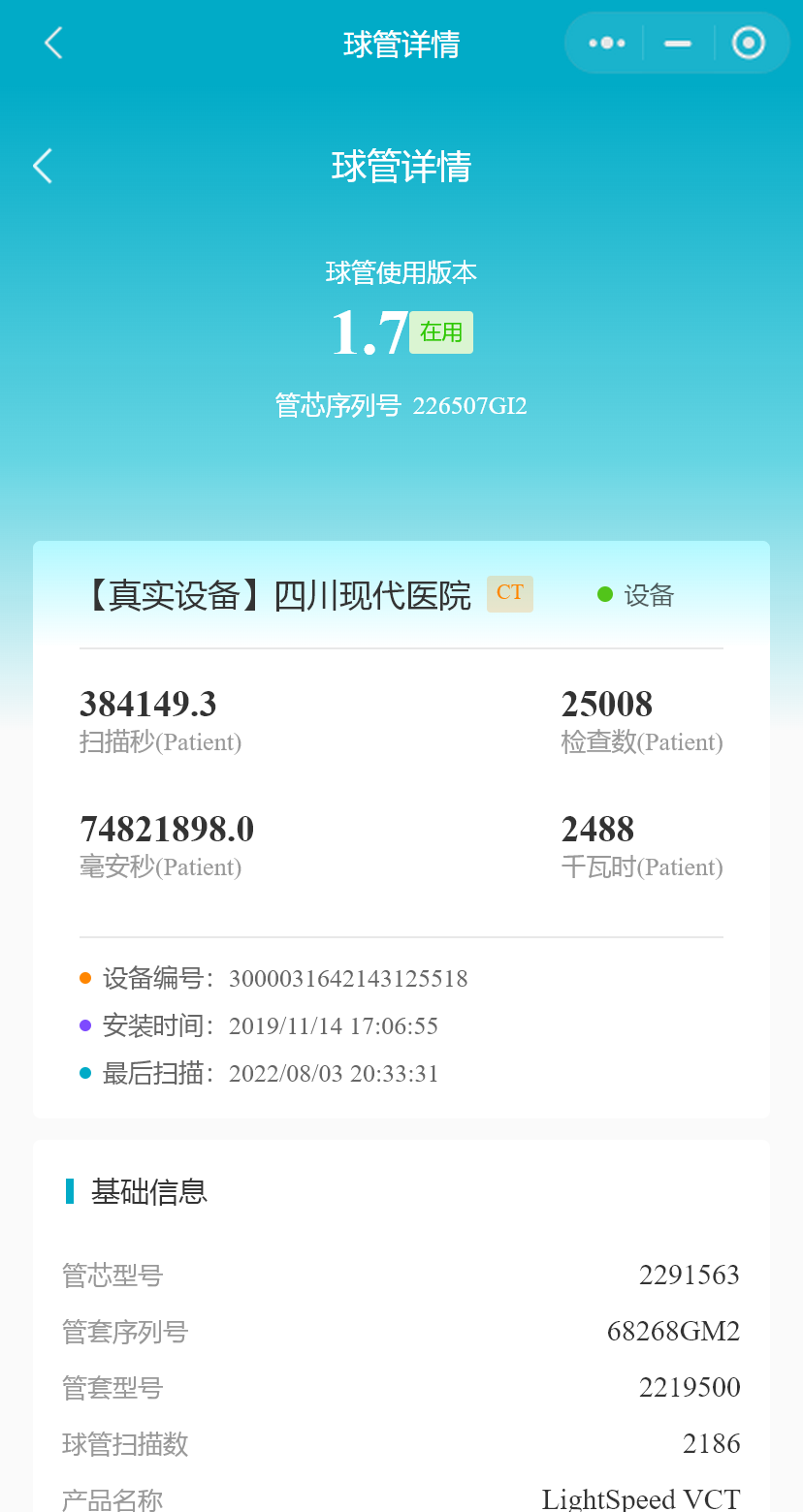 在设备列表中,选择一台CT设备或PETCT设备,点击按钮,进入“球管详情”页面,将展示CT、PETCT设备当前在用球管的信息,扫描秒统计,打火数和检查数等。