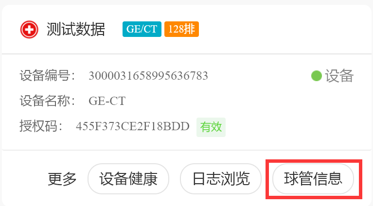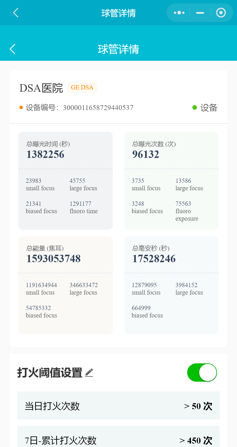 系统支持展示当前在用球管的基本信息和球管信息,如球管总曝光时间、球管总曝光次数、总能量、总毫安秒、球管历史总打火数、球管近30日打火数、球管7日打火数。