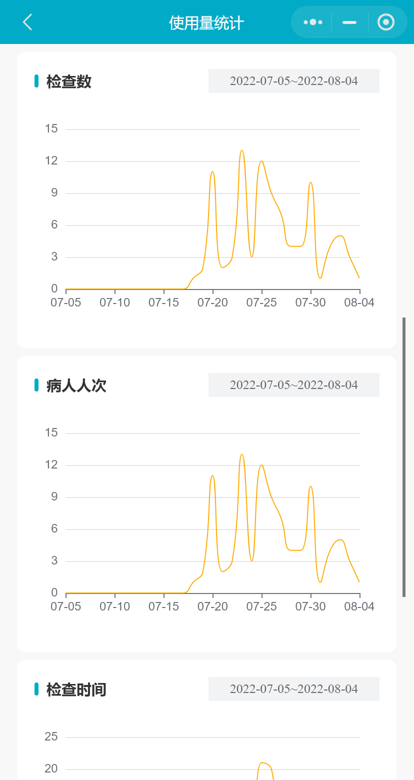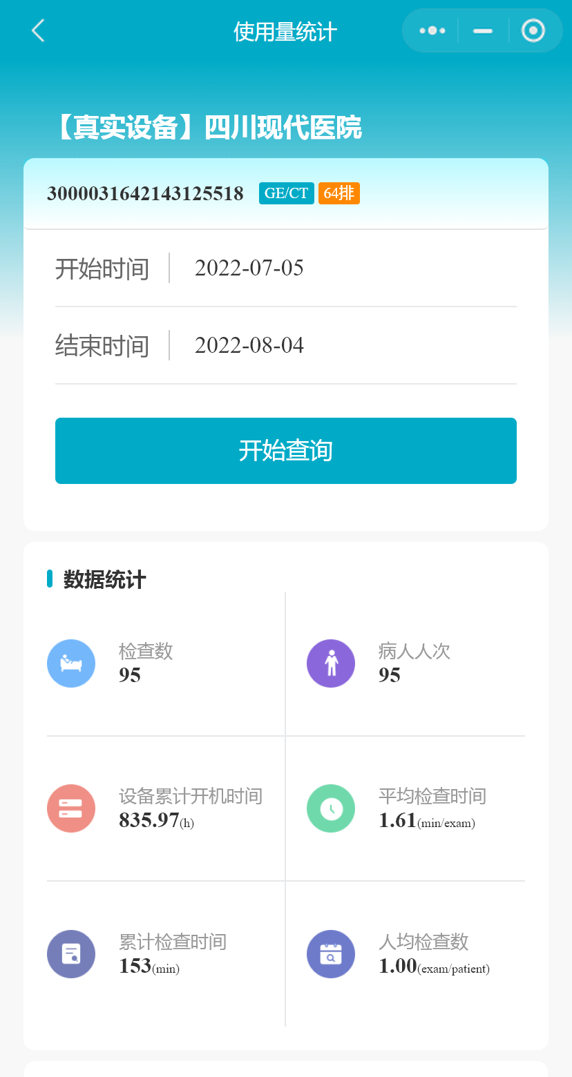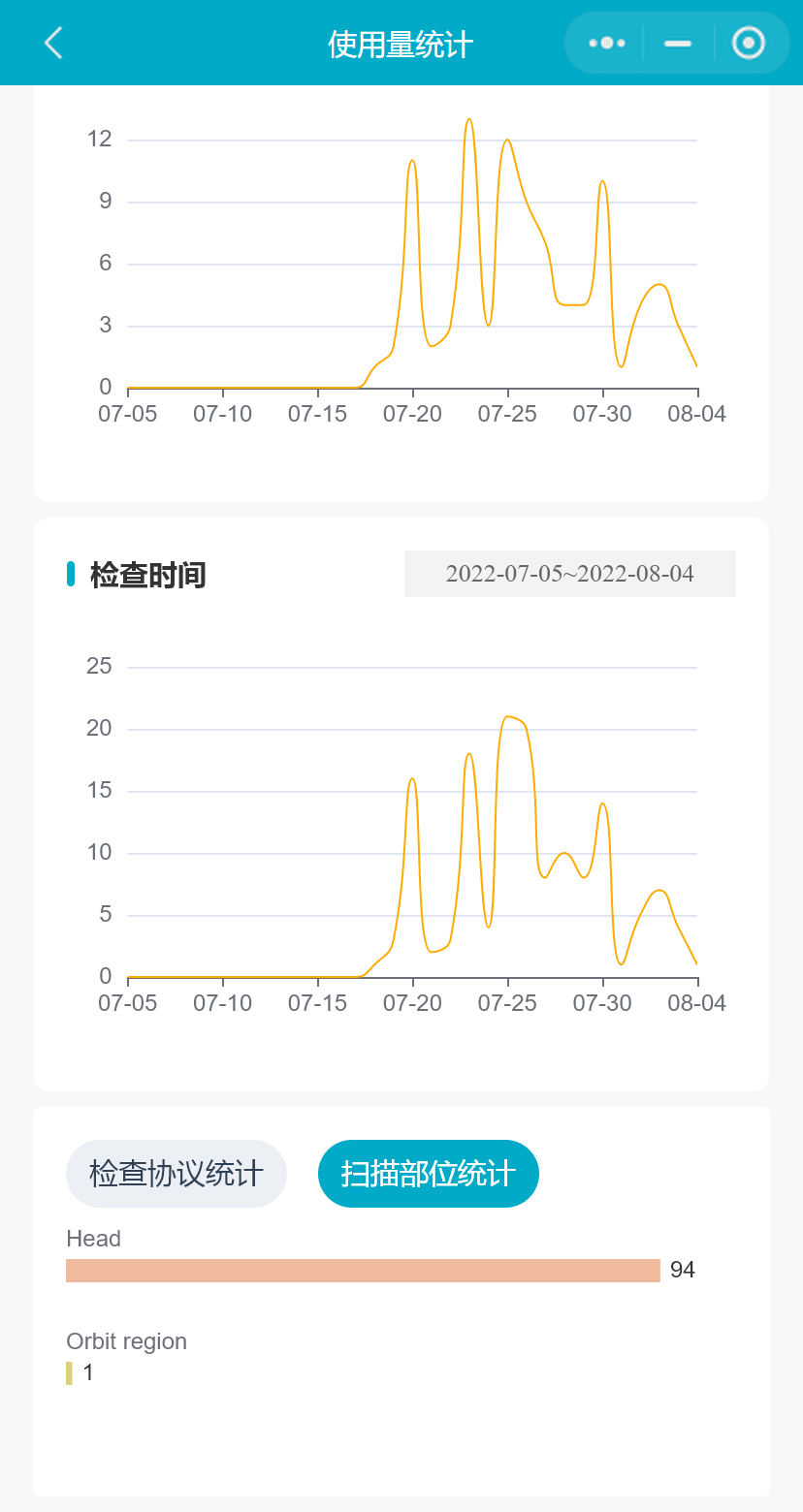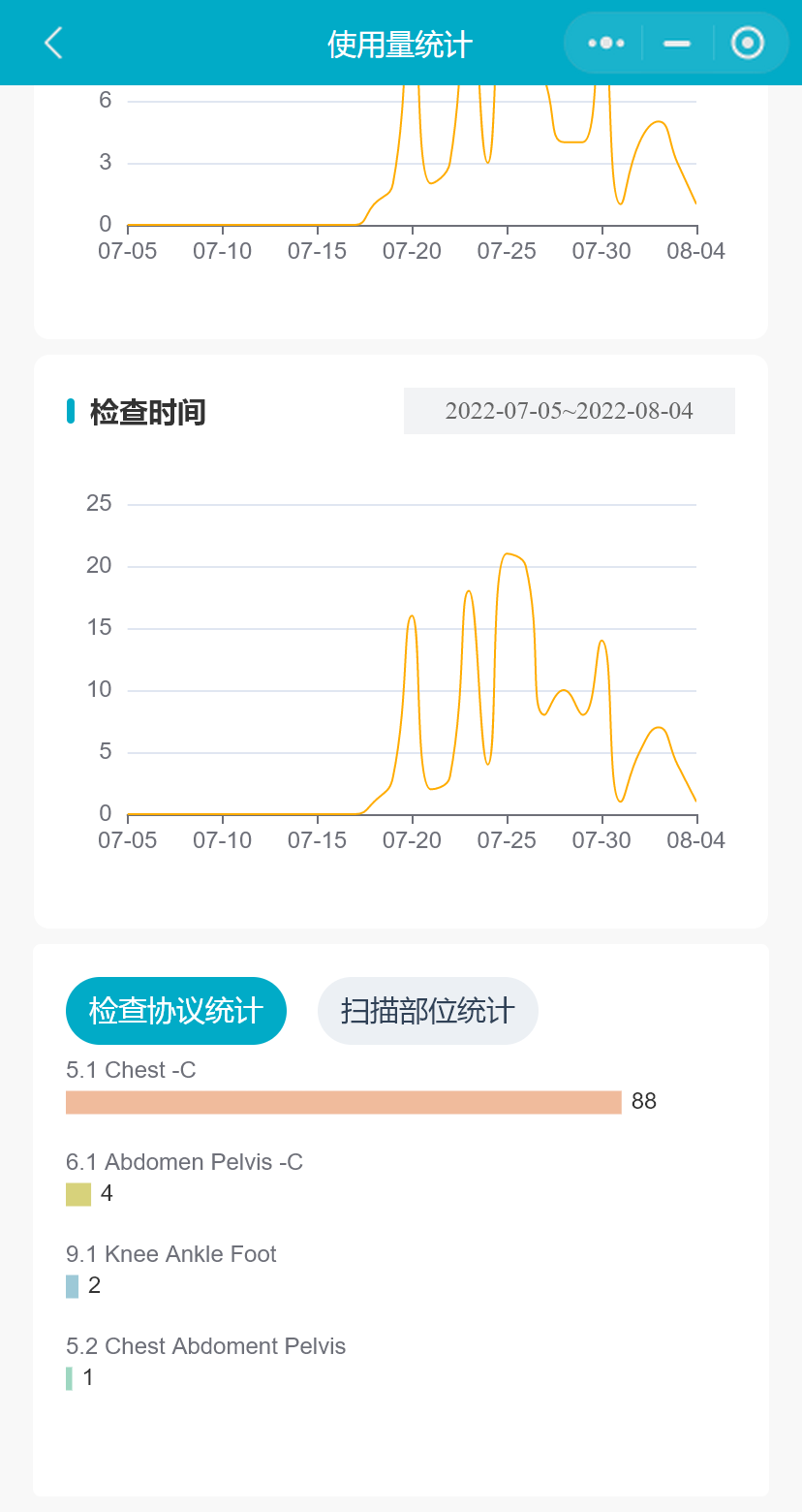 小程序支持用户查看该台设备任意31天的使用量统计数据(默认展示最近31天的数据量),数据统计包括检查数、病人人次、设备累计开机时间、平均检查时间、累计检查时间、人均检查数、检查协议统计和扫描部位统计;以及每日的检查数、病人人次和检查时间的分布情况。