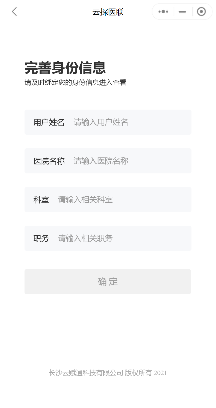 当云探医联用户在WEB端创建了医院用户后,医院用户使用正确的手机号登录微信小程序后,第一次会提示用户绑定个人信息,填写用户姓名、医院名称、科室和职务后提交。支持在小程序中修改个人绑定的信息。(医院用户只能登录微信小程序,无法登录WEB端云探医联)。