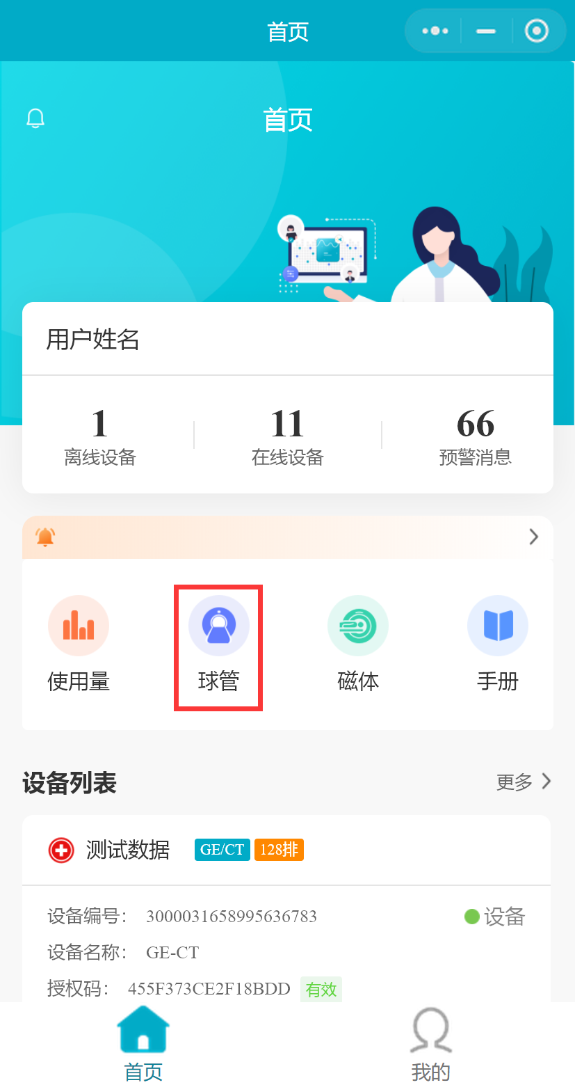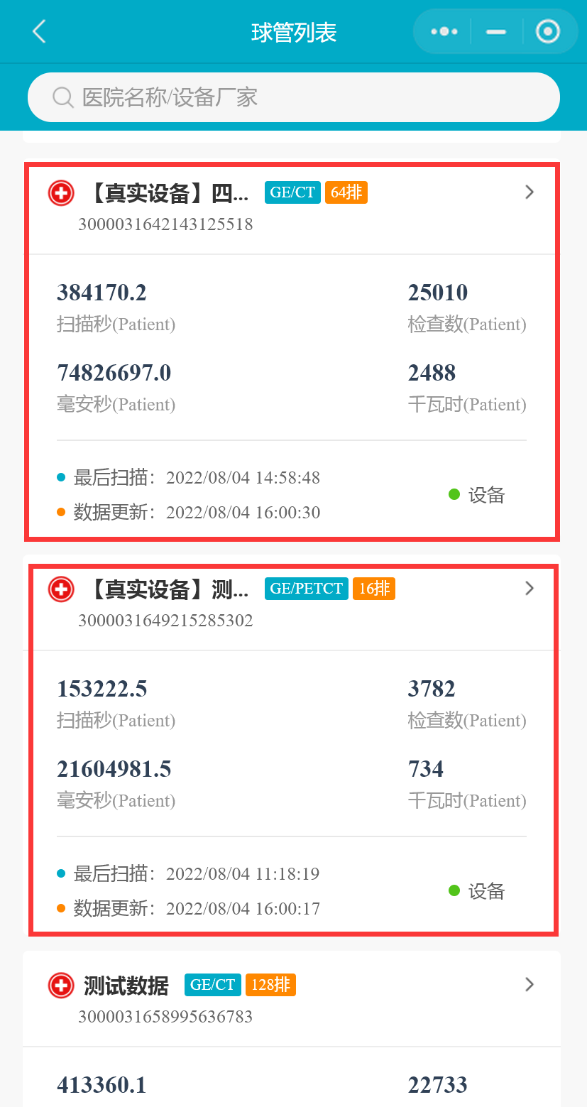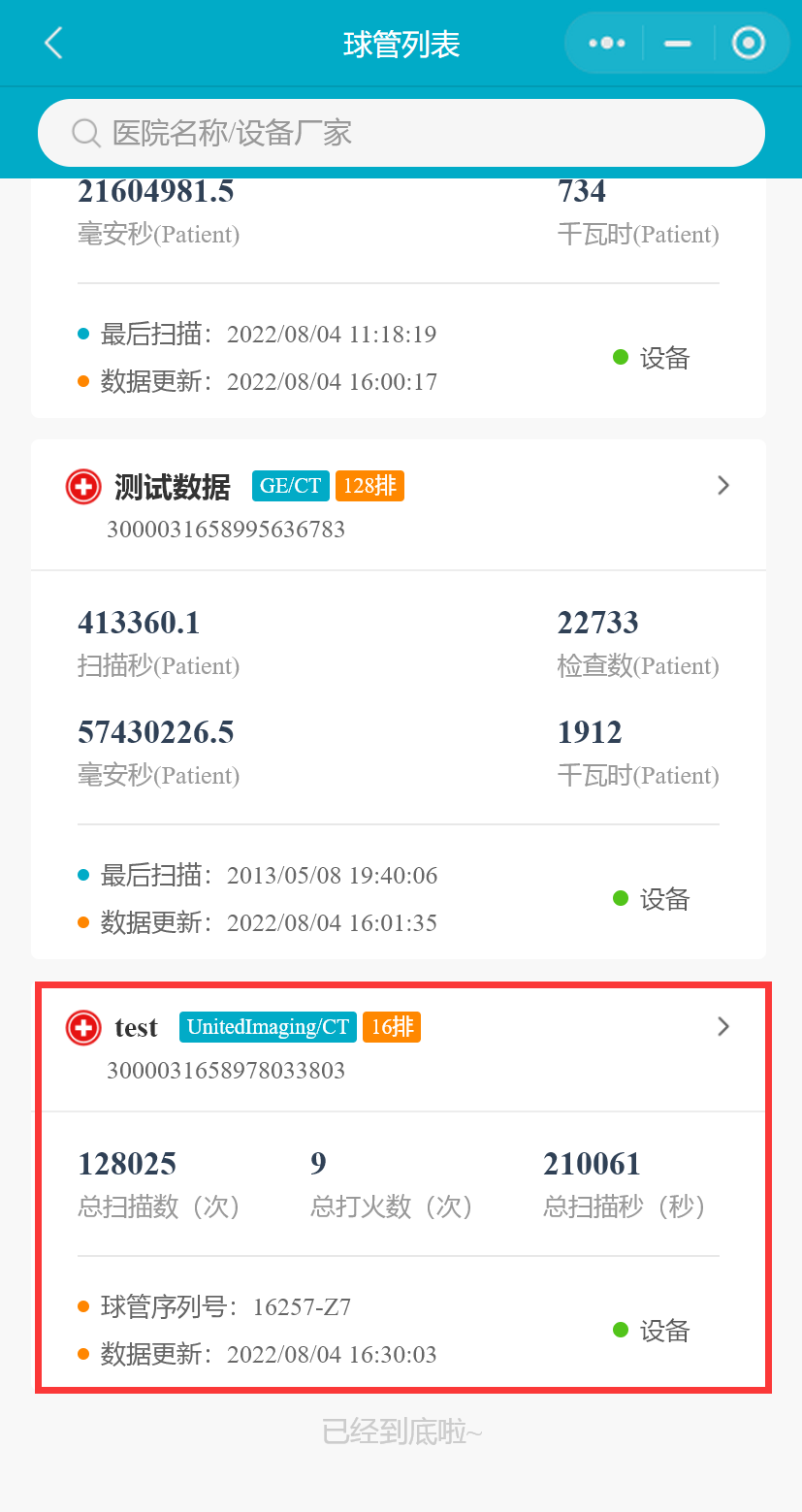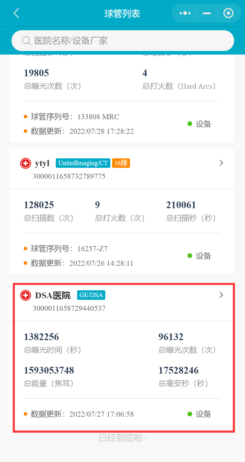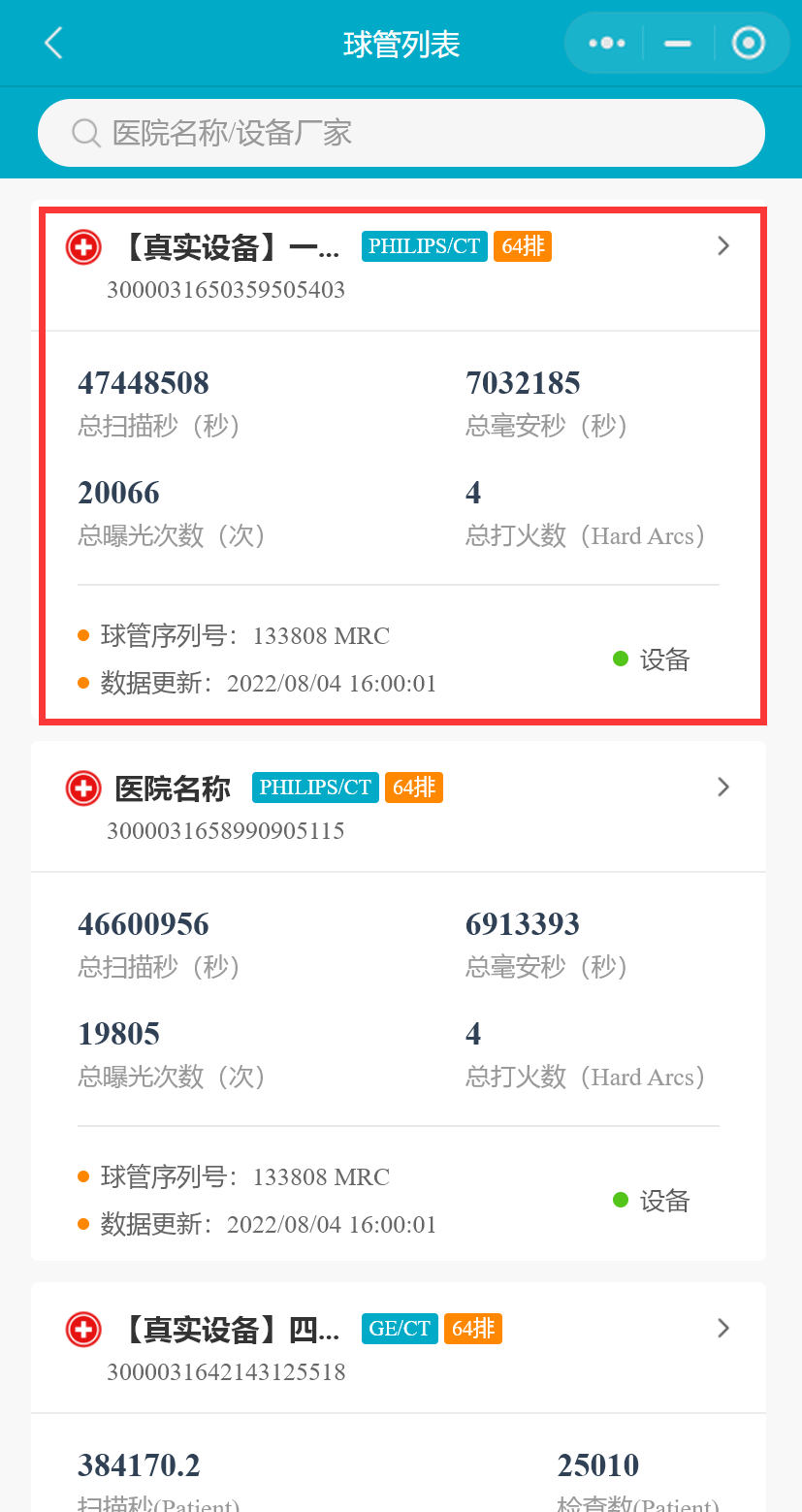 点击首页中的“球管”按钮进入球管列表页面。球管列表页中,可以支持按照“医院名称”、“设备厂家”搜索,搜索结果将展示特定查询条件的设备列表。